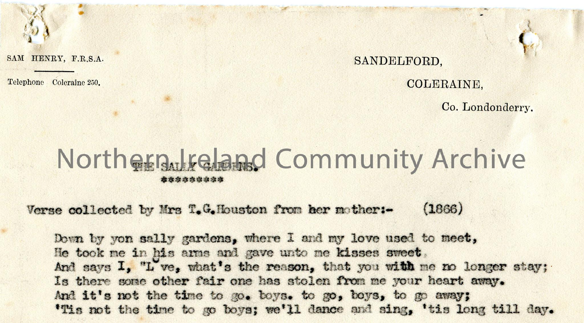 Typed verse of a song titled, 'The Sally Gardens', on personal headed paper of Sam Henry's. States, 'Verse collected by Mrs T.G.Houston from her mother:- (1866)'.