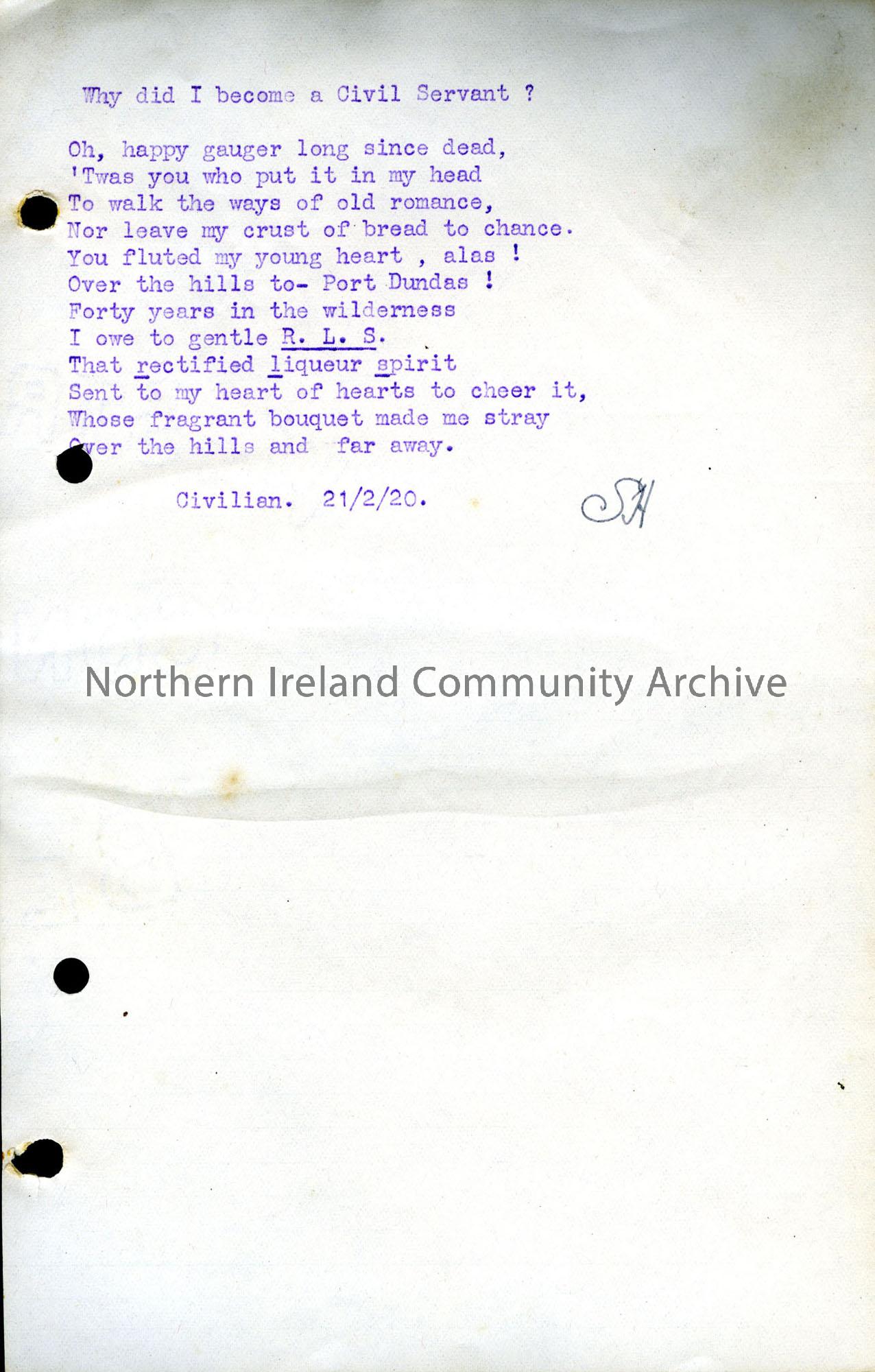 Typed verse taken from a civilian by Sam Henry titled, ‘Why did I become a civil servant?’ Dated 21st February, 1920.