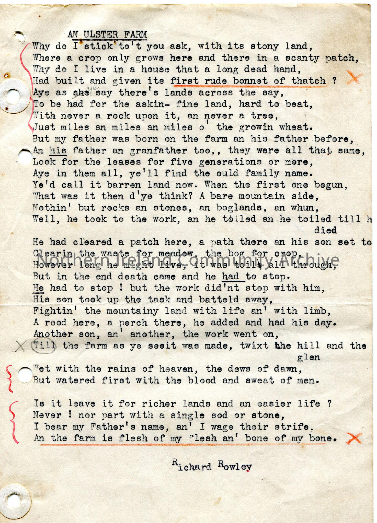 Typed verses of a poem or words to a song titled, ‘An Ulster Farm’, by Richard Rowley. Descriptions of generations on an Ulster farm.