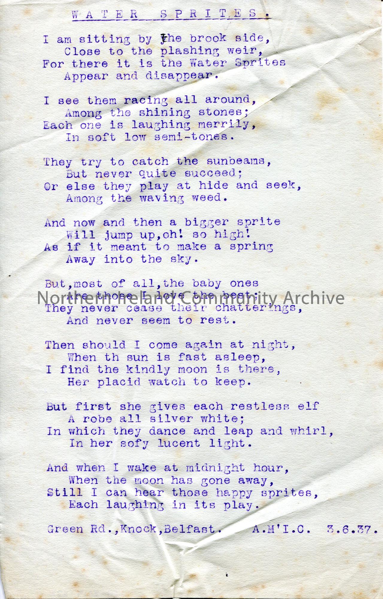 Typed verses of a song or poem titled, ‘Water Sprites’. From Green Road, Knock, Belfast. A.M’I.C. 3.6.37.