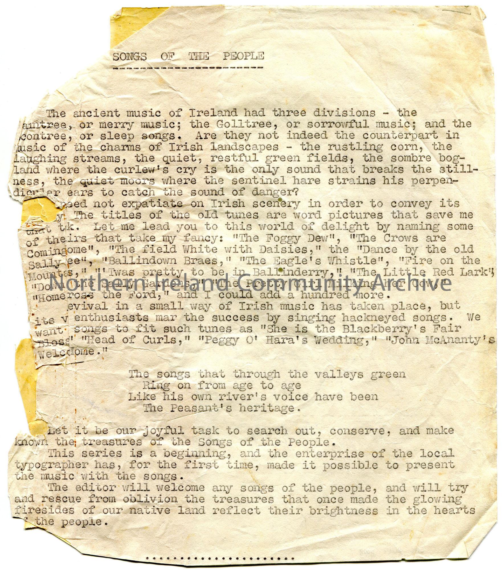 Typed version of an introduction for Sam Henry’s ‘Songs of the People’ series printed in the ‘Constitution’.