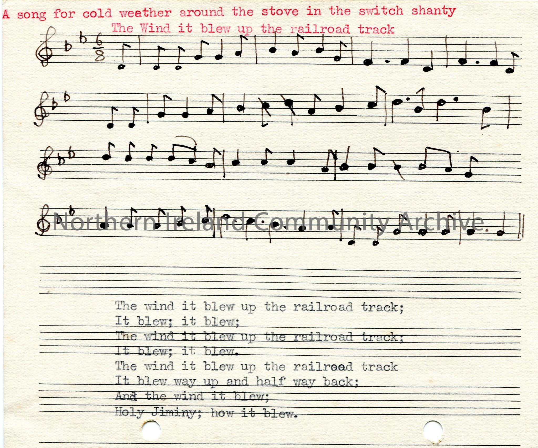 Typed words and hand drawn staff notation to 'The Wind it Blew Up the Railroad Track'.