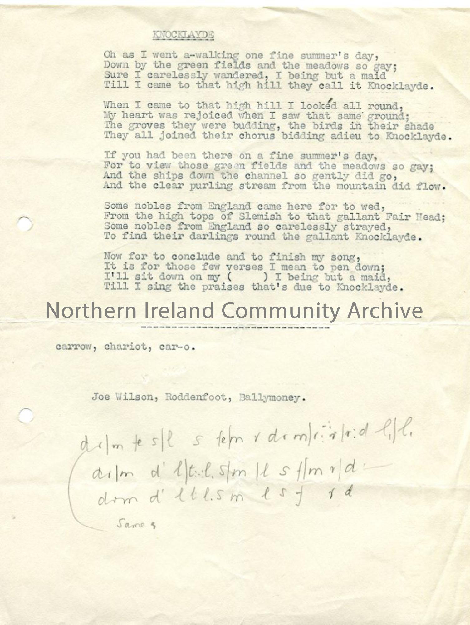 Typed words and handwritten tonic sol-fa notation to 'Knocklayde'. From Joe Wilson, Roddenfoot, Ballymoney.
