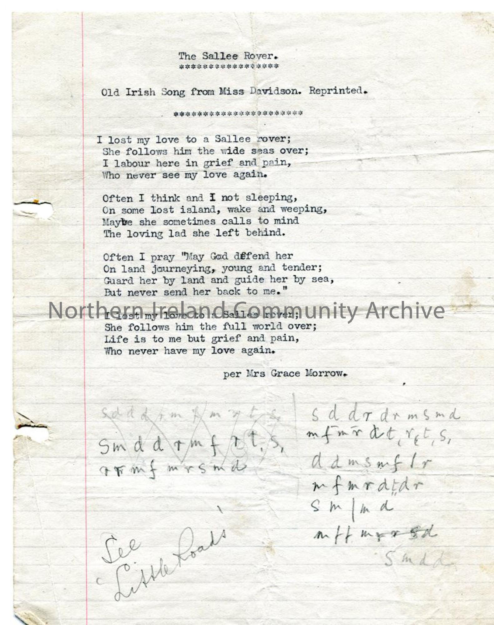 Typed words and handwritten tonic sol-fa notation to ‘The Sallee Rover’