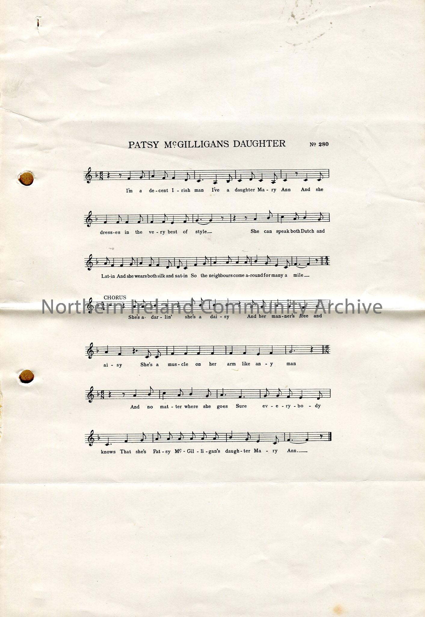 Typed words and staff notation to ‘Patsy McGilligan’s Daughter’