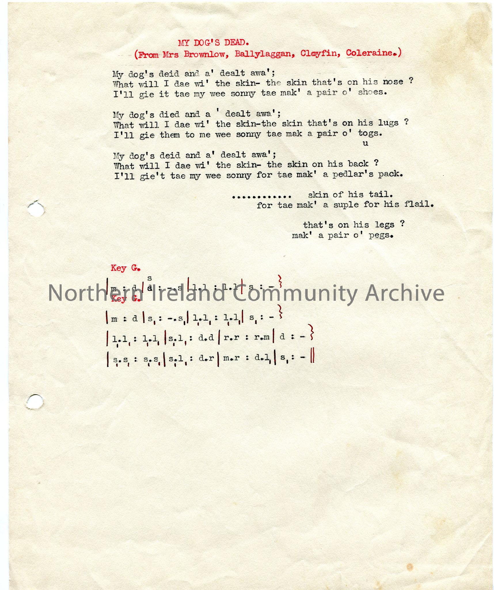 Typed words and tonic sol-fa notation for ‘My Dog’s Dead’. Uses local dialect.