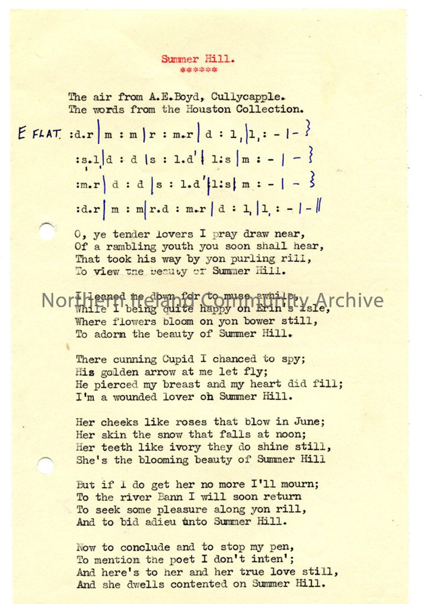 Typed words and tonic sol-fa notation of 'Summer Hill'. From A E Boyd, Cullycapple.