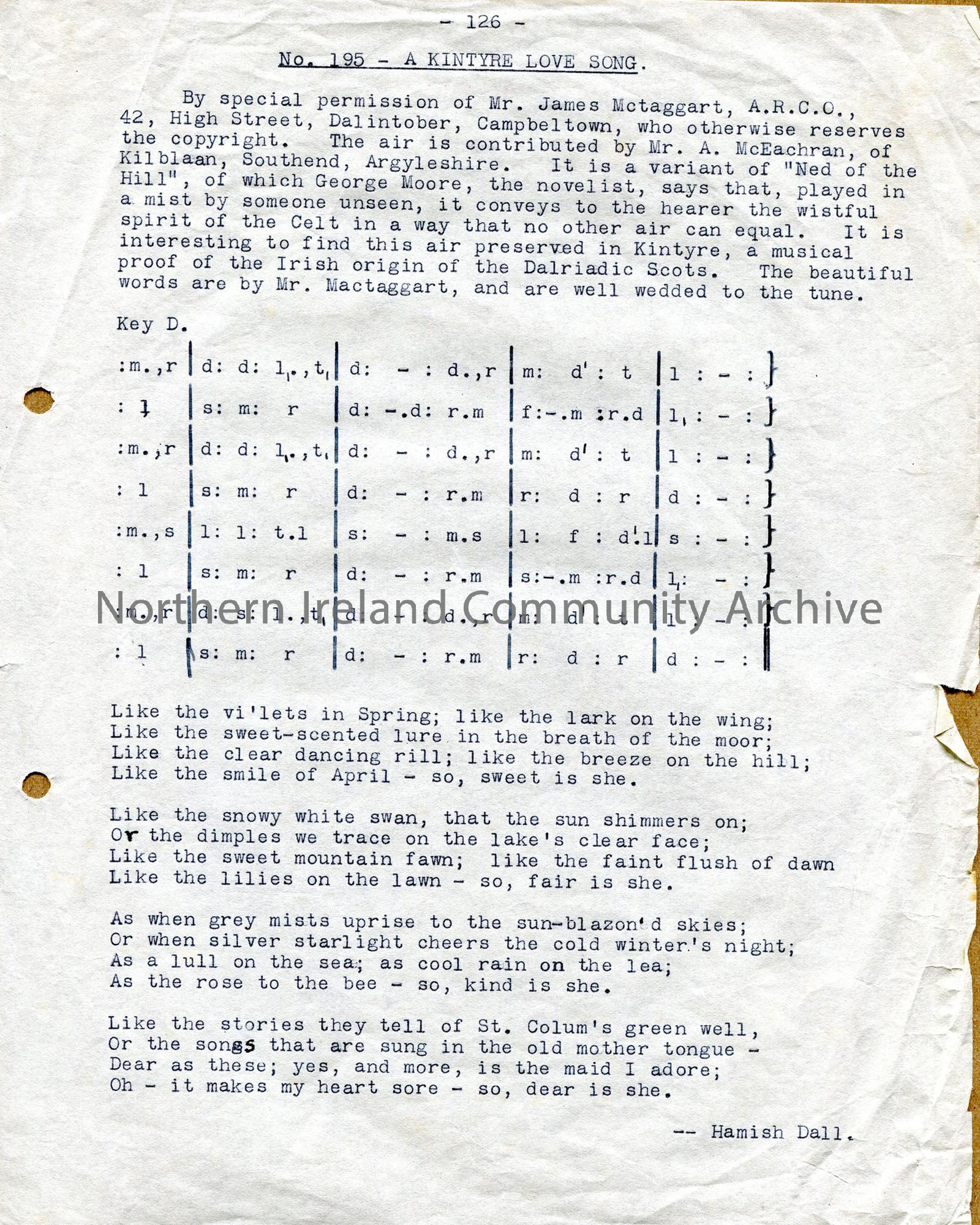 Typed words and tonic sol-fa notation to ‘A Kintyre Love Song’. Introductory paragraph – ‘points to Irish origin of Dalriadic Scots’