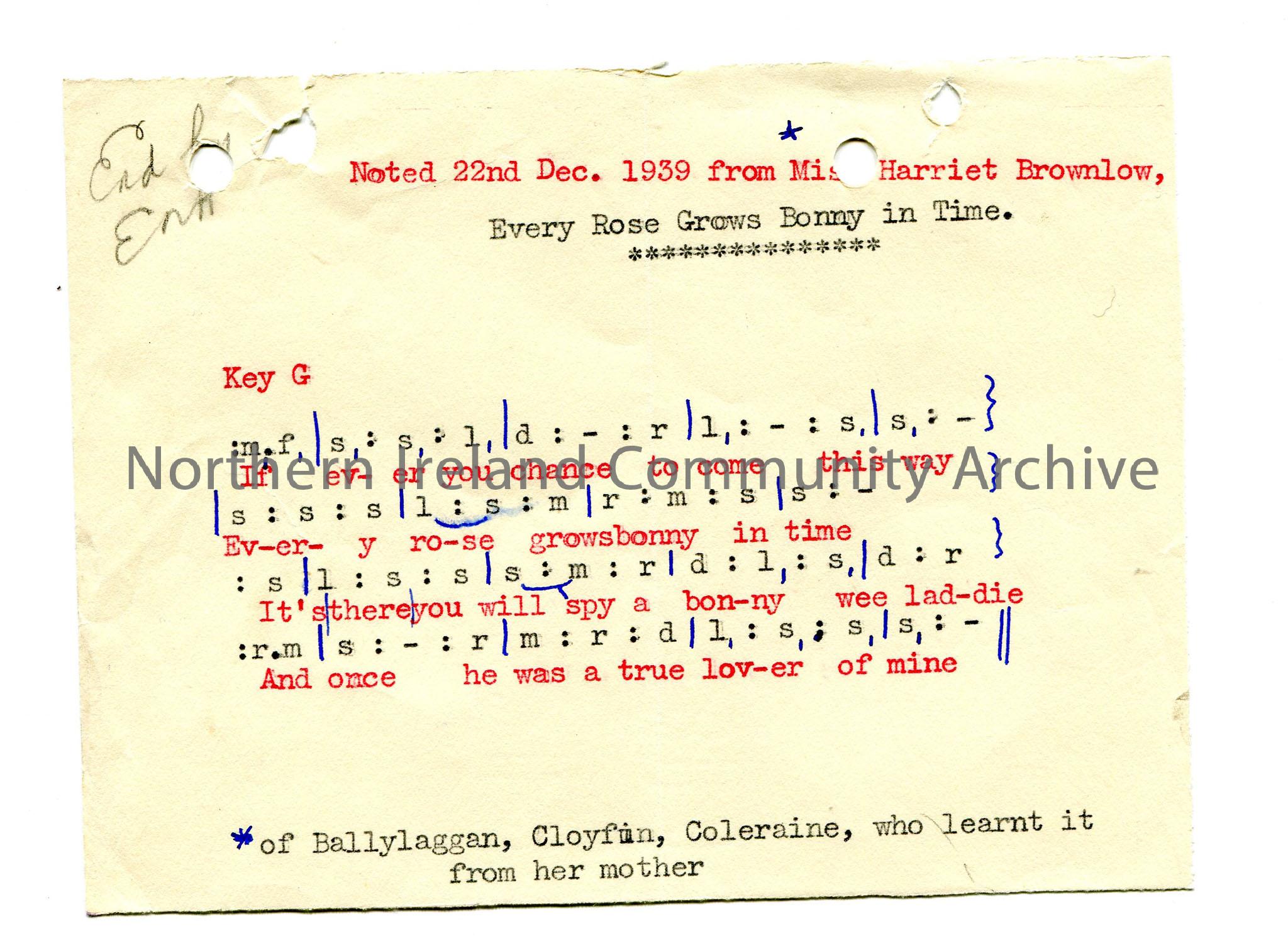Typed words and tonic sol-fa notation to a version of ‘Every Rose Grows Bonny in Time’.