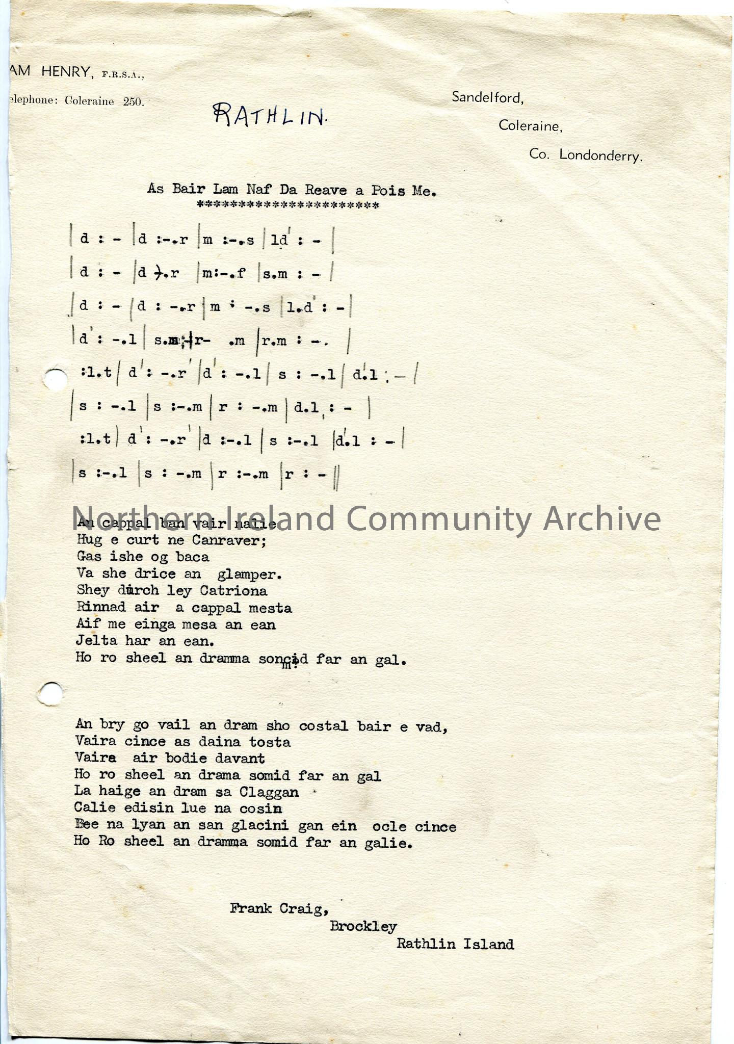 Typed words and tonic sol-fa notation to ‘As Bair Lam Naf Da Reave a Pois Me’, with verses in Gaelic.