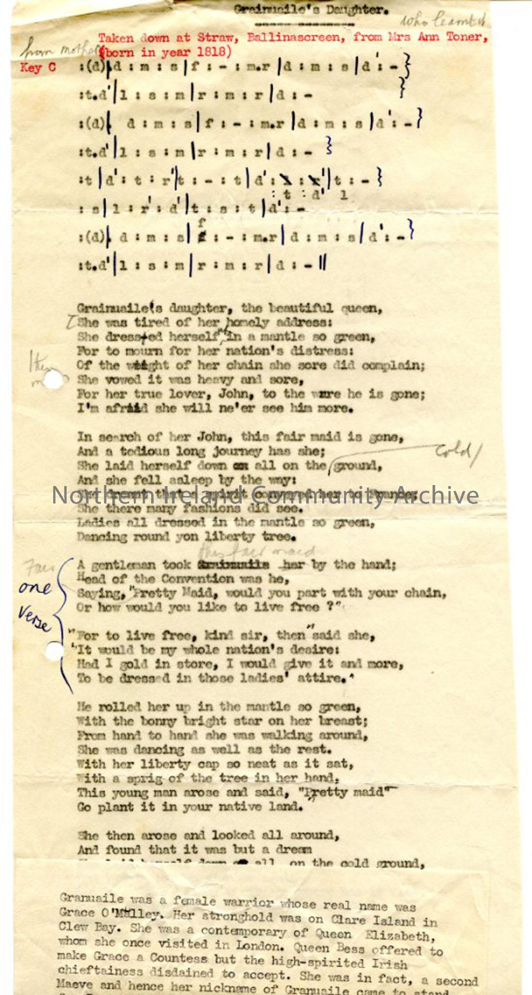 Typed words and tonic sol=fa notation to 'Grainuaile's daughter'. Small explanatory historical note on added paper affixed to page.