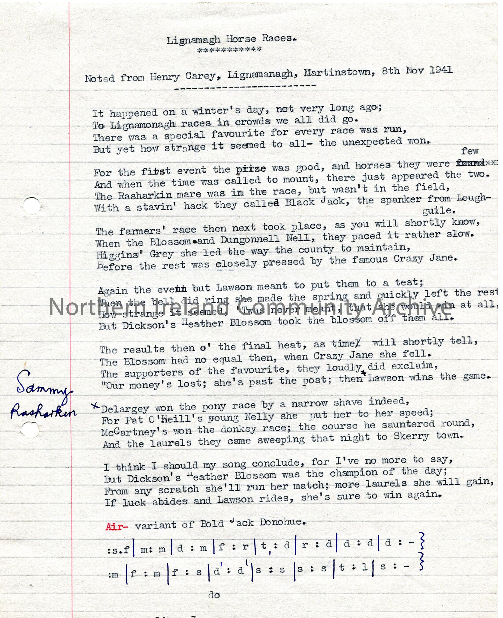 Typed words and tonic sol-fa notation to ‘Lignamagh Races’.