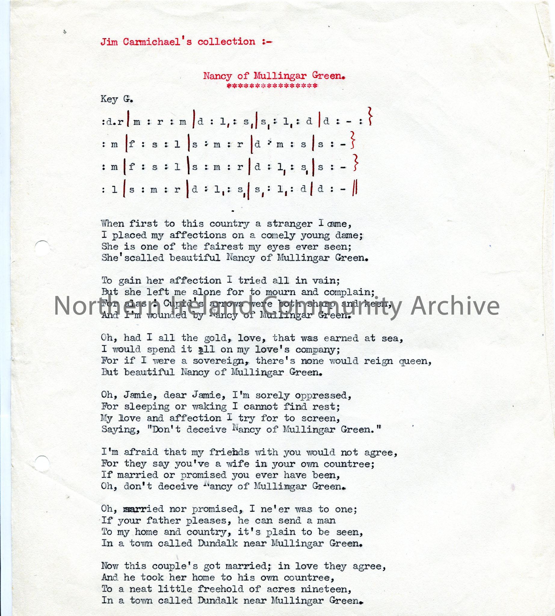 Typed words and tonic sol-fa notation to ‘Nancy of Mullingar’.