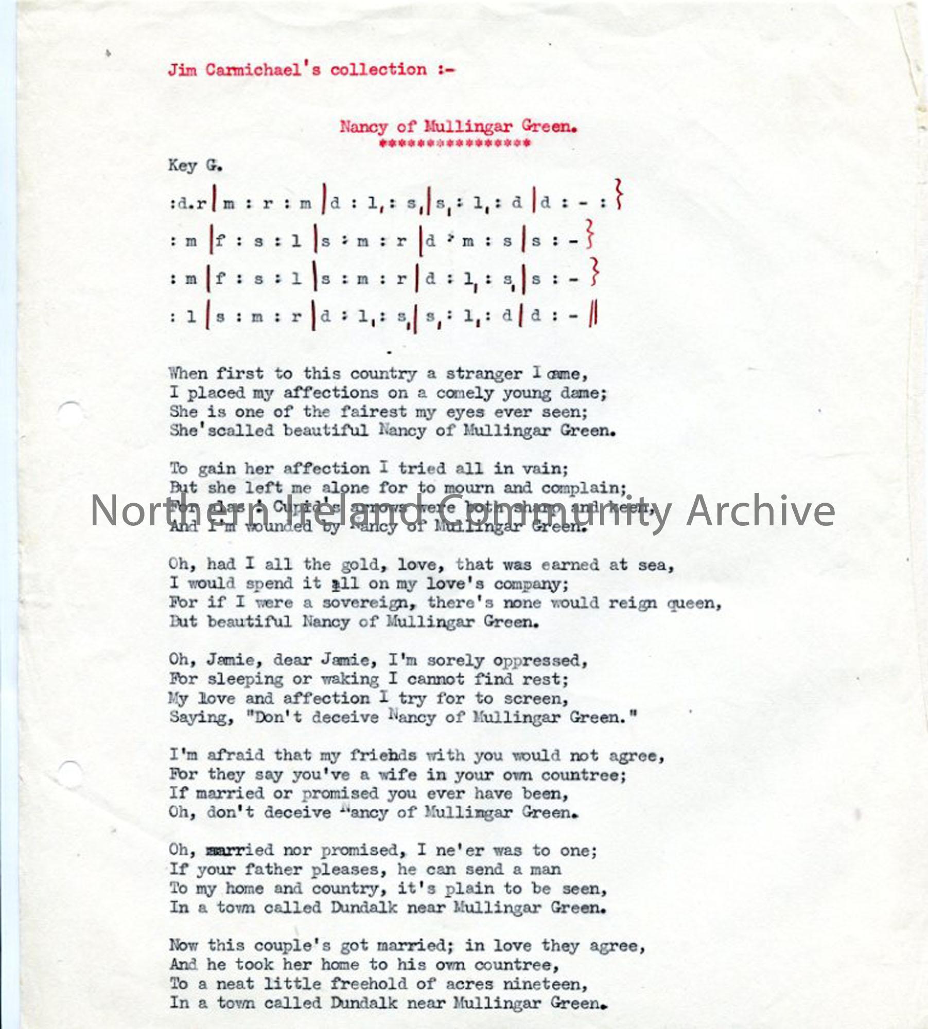 Typed words and tonic sol-fa notation to 'Nancy of Mullingar'. From Jim Carmichael.