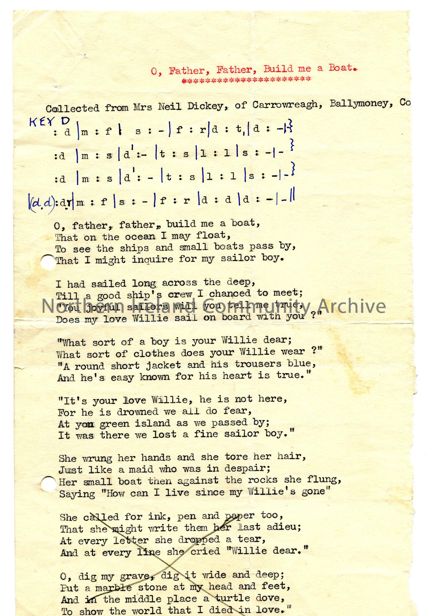 Typed words and tonic sol-fa notation to ‘O, Father, Father, Build me a Boat’.