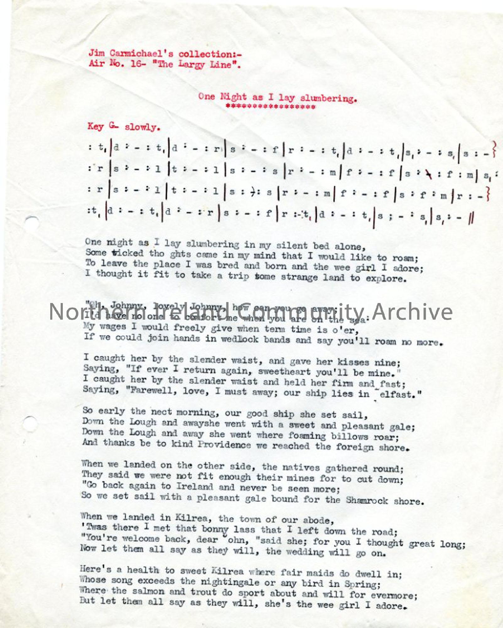 Typed words and tonic sol-fa notation to 'One Night as I Lay Slumbering'. Air - 'The Largy Line'. From Jim Carmichael.