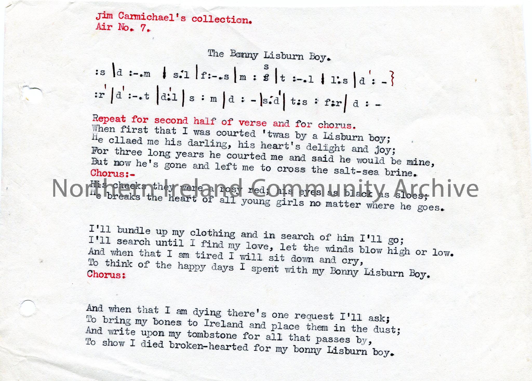 Typed words and tonic sol-fa notation to ‘The Bonny Lisburn Boy’.