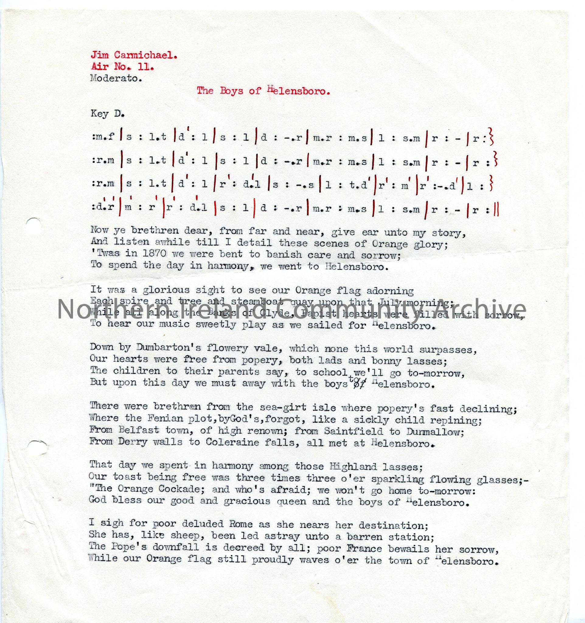 Typed words and tonic sol-fa notation to ‘The Boys of Helensboro’. Uses local dialect. Mentions Clyde, Dumbarton, Belfast, Derry’s walls, Coleraine. O…