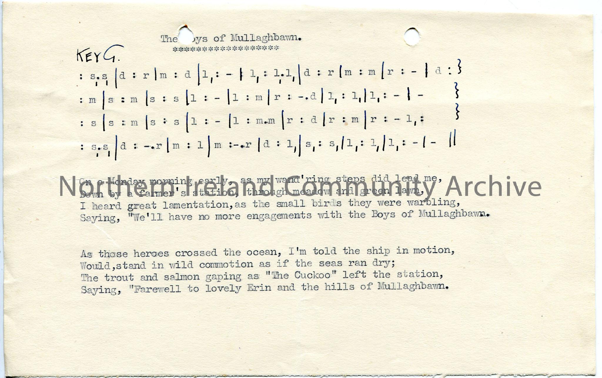 Typed words and tonic sol-fa notation to ‘The Boys of Mullaghbawn’.