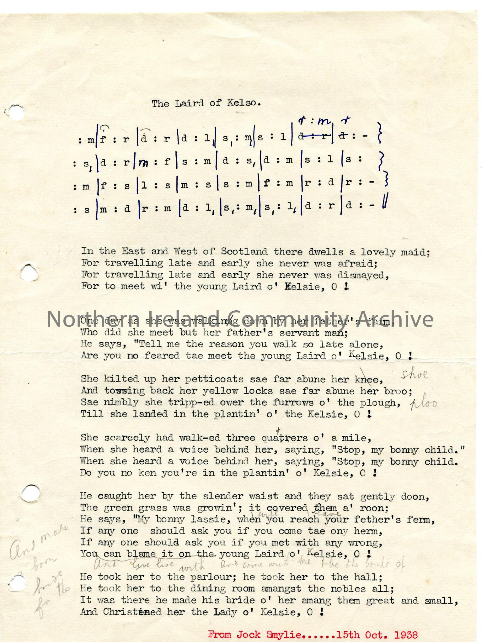 Typed words and tonic sol-fa notation to ‘The Laird of Kelso’. Uses local dialect.