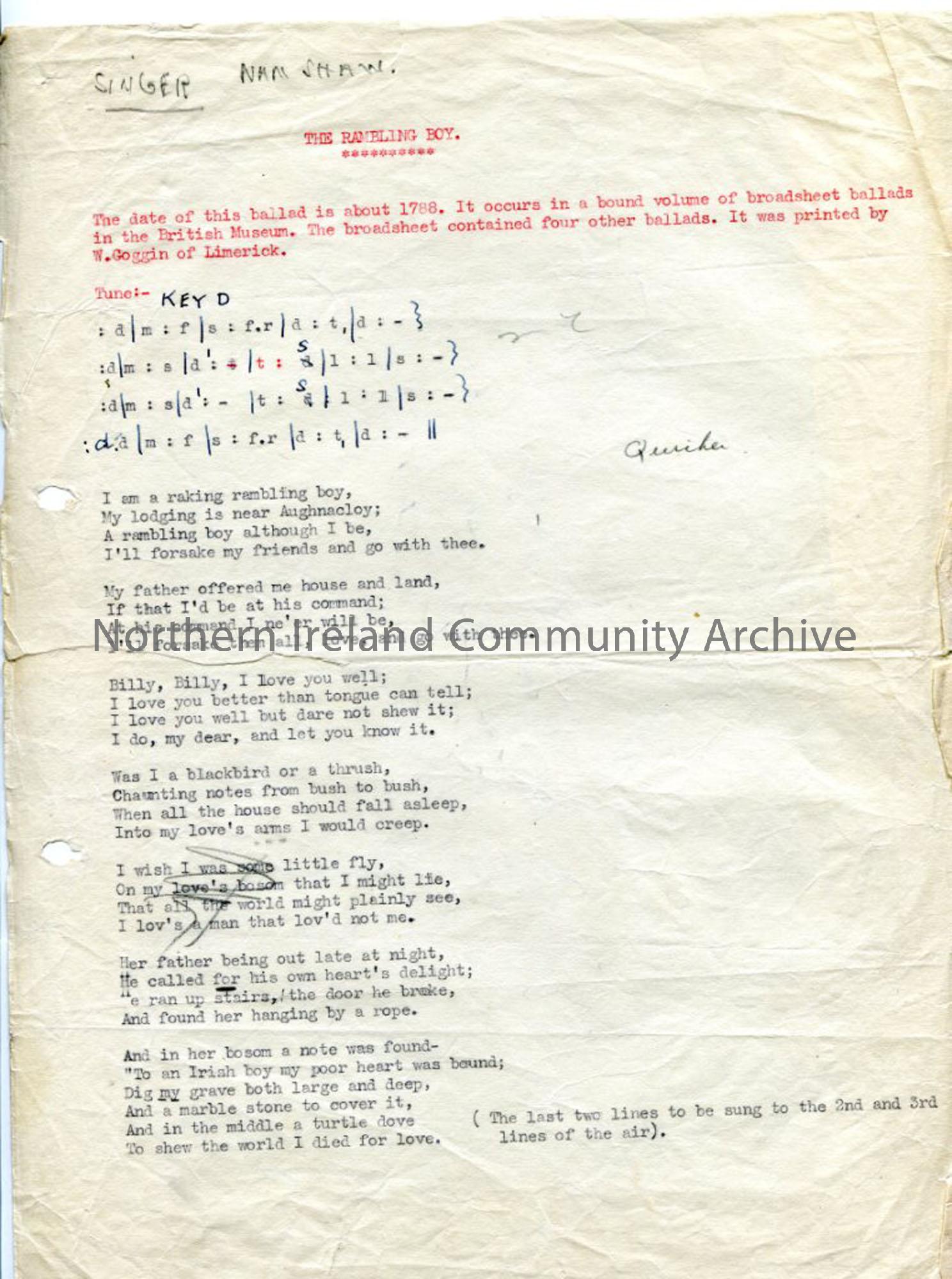 Typed words and tonic sol-fa notation to 'The Rambling Boy'. Added pencil note - 'singer - Nan Shaw'.