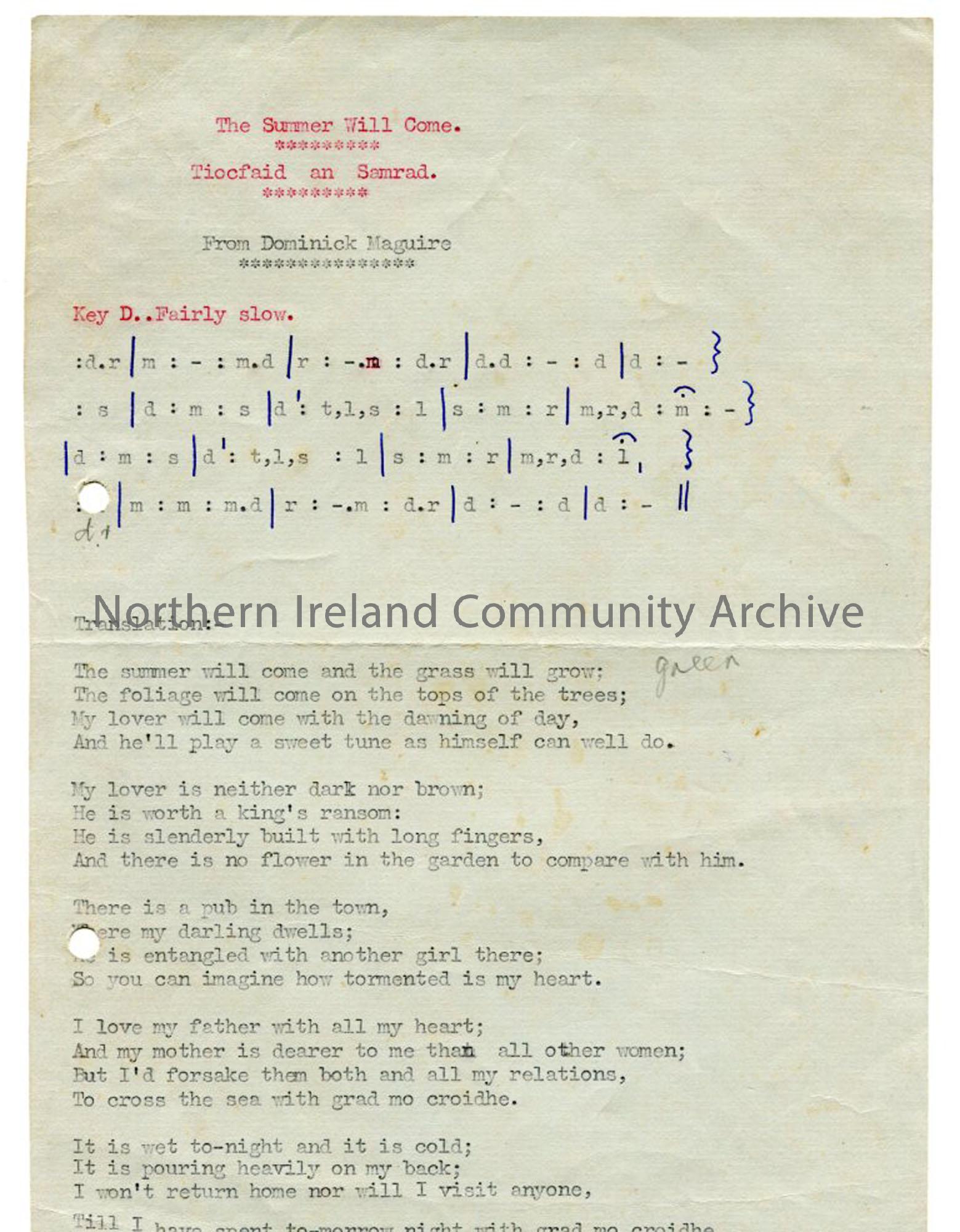 Typed words and tonic sol-fa notation to 'The Summer Will Come' (Tioc an Samrad). From Dominick Maguire.