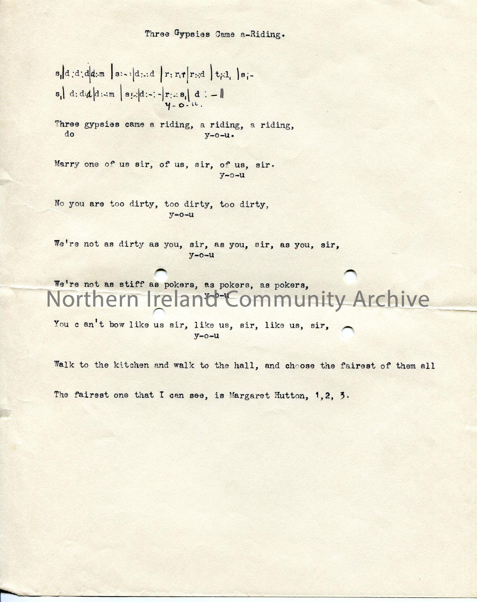 Typed words and tonic sol-fa notation to ‘Three Gypsies Came a-Riding’ – singing game – name inserted in song is ‘Margaret Hutton’ – one of Park Stree…