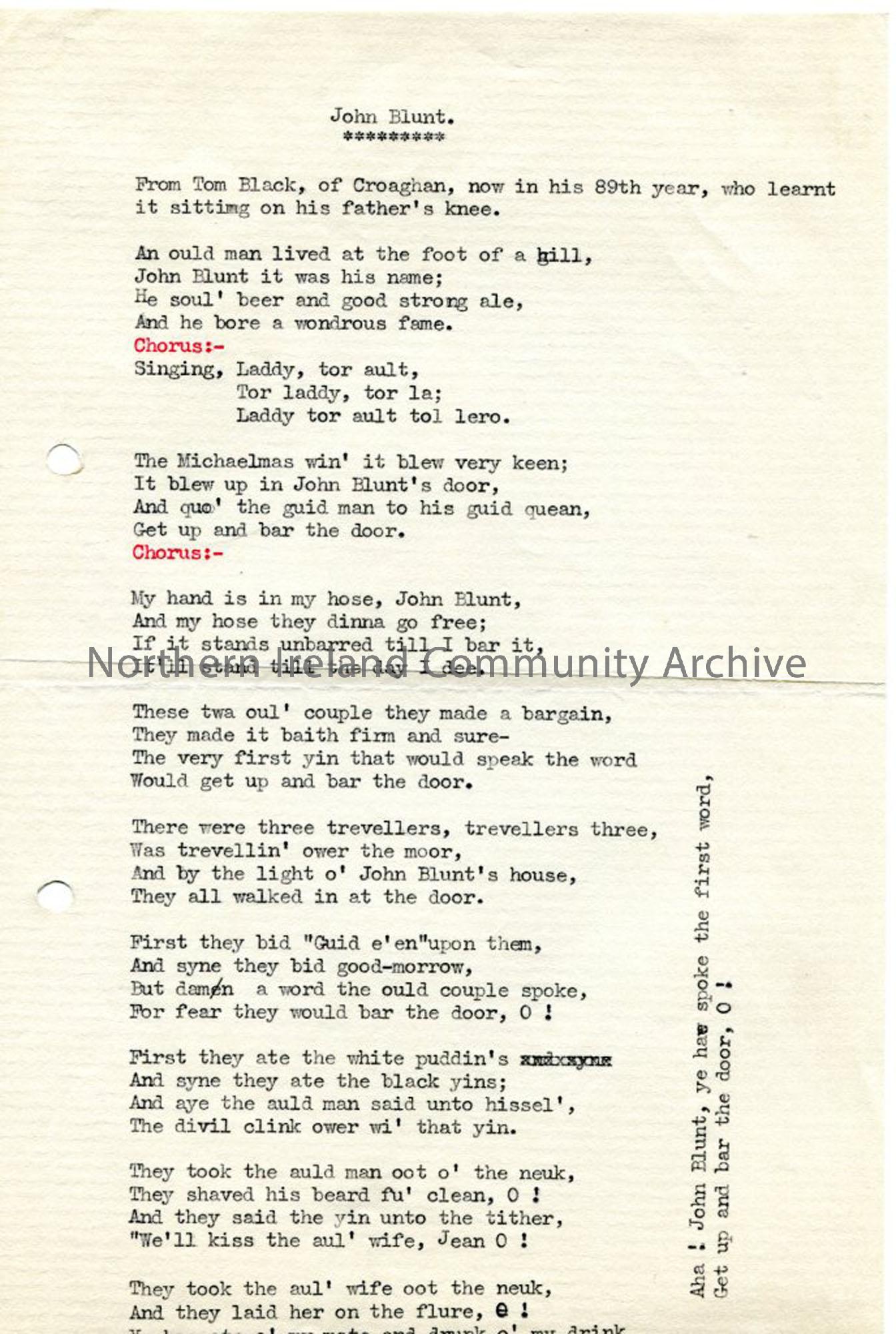 Typed words 'John Blunt'. From Tom Black, Croaghan. Now in his 89th year, he learned it at his father's knee.