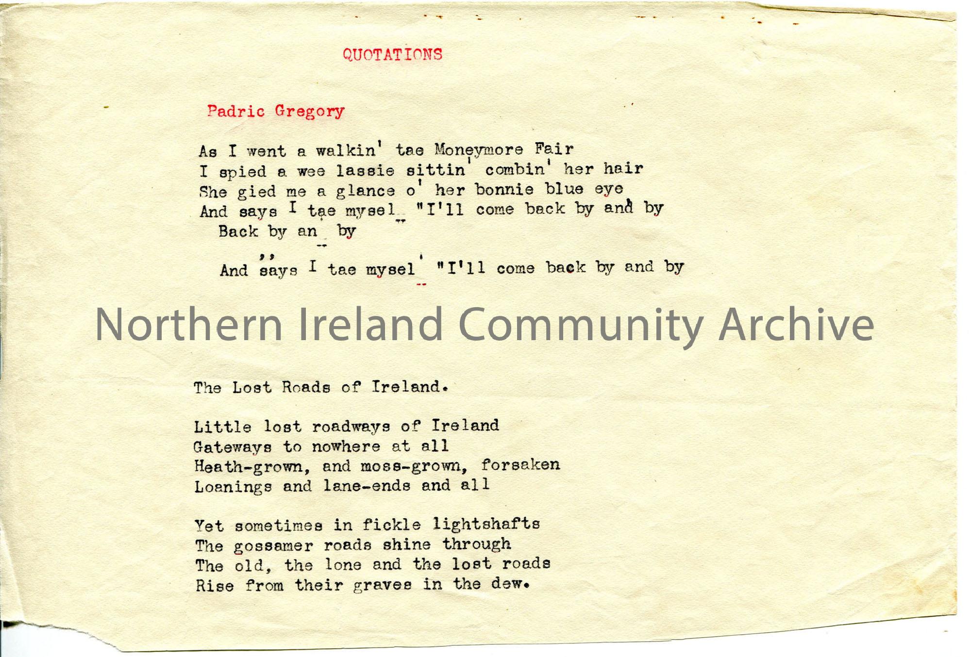 Typed words to 2 separate verses under heading ‘Quotations’. Uses local dialect.