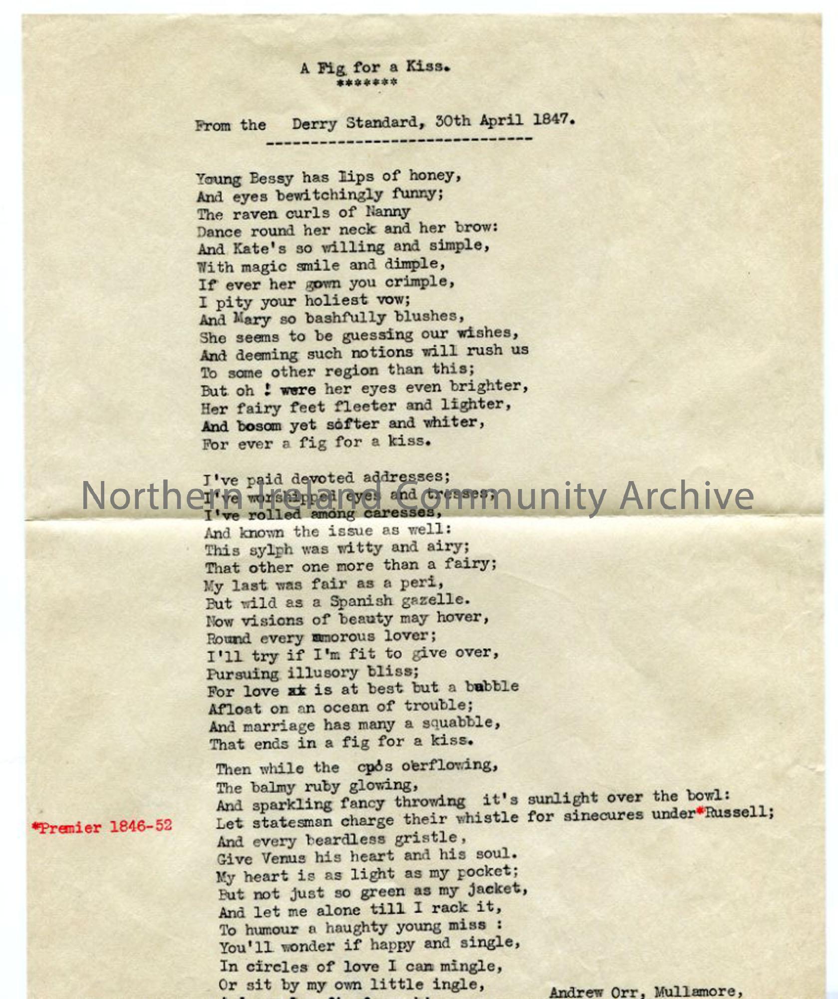 Typed words to 'A Fig for a Kiss'. Poem by Andrew Orr.