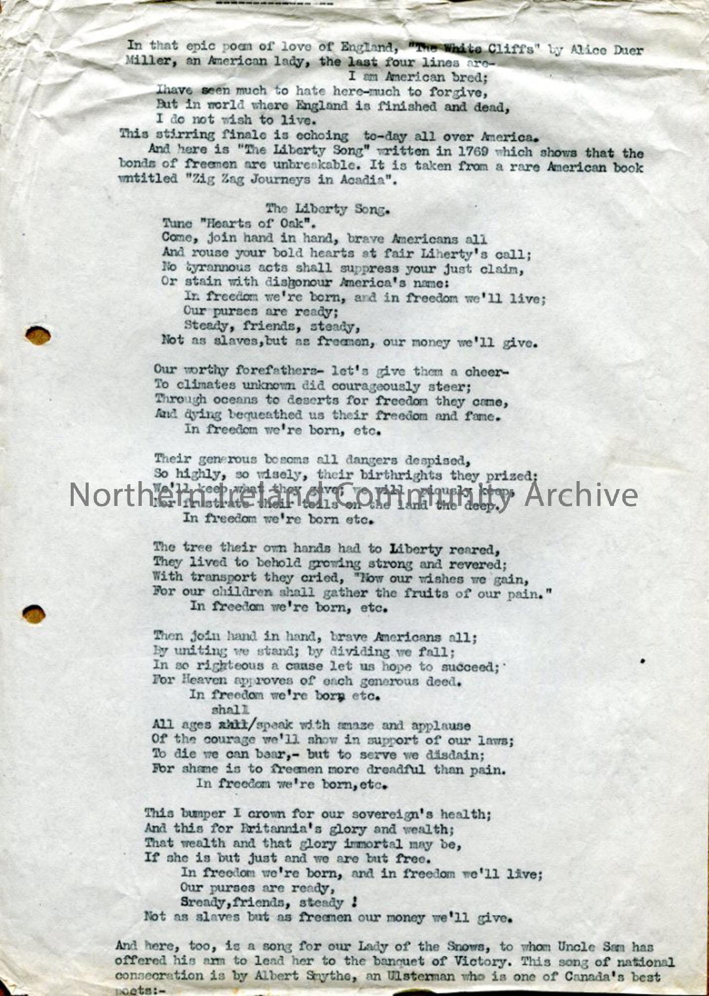 Typed words to a version of 'The Liberty Song' - that in 'Zig Zag Journeys in Acadia'. This page ends on a colon but the continuing page is absent.