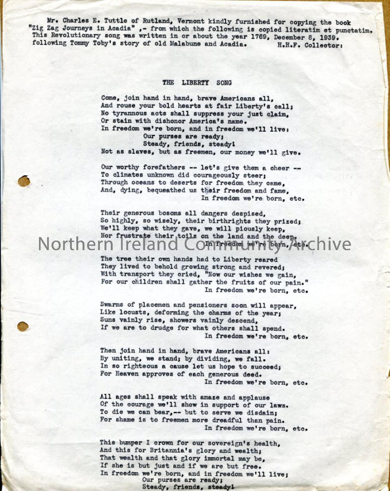 Typed words to a version of 'The Liberty Song', taken from 'Zig Zag Journeys in Acadia'. Written circa 1769. Note at head of song - typed initials H.H.F. - ? Helen Hartness Flanders.