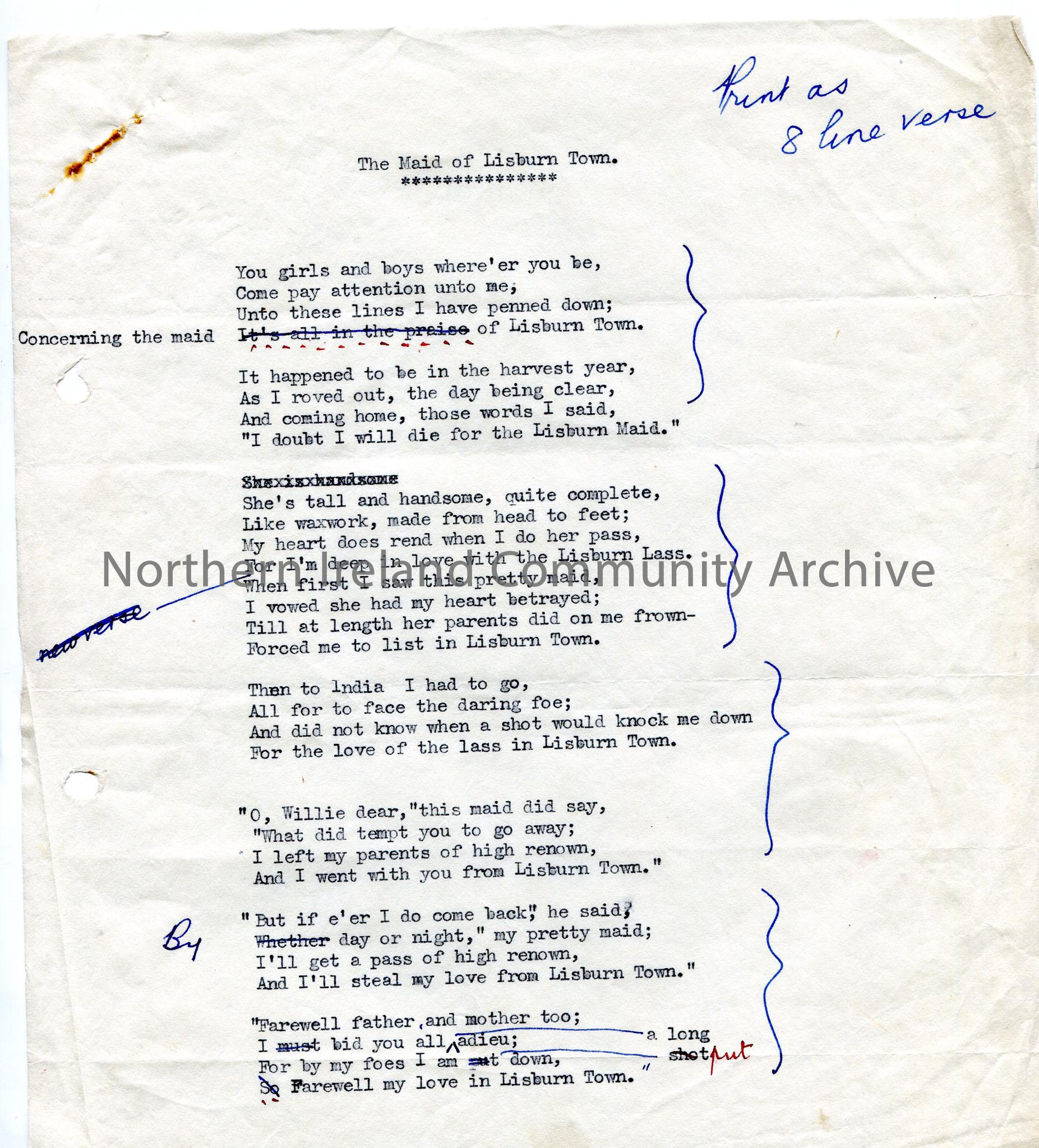 Typed words to alternative version of ‘The Maid of Lisburn Town’. Mentions India.