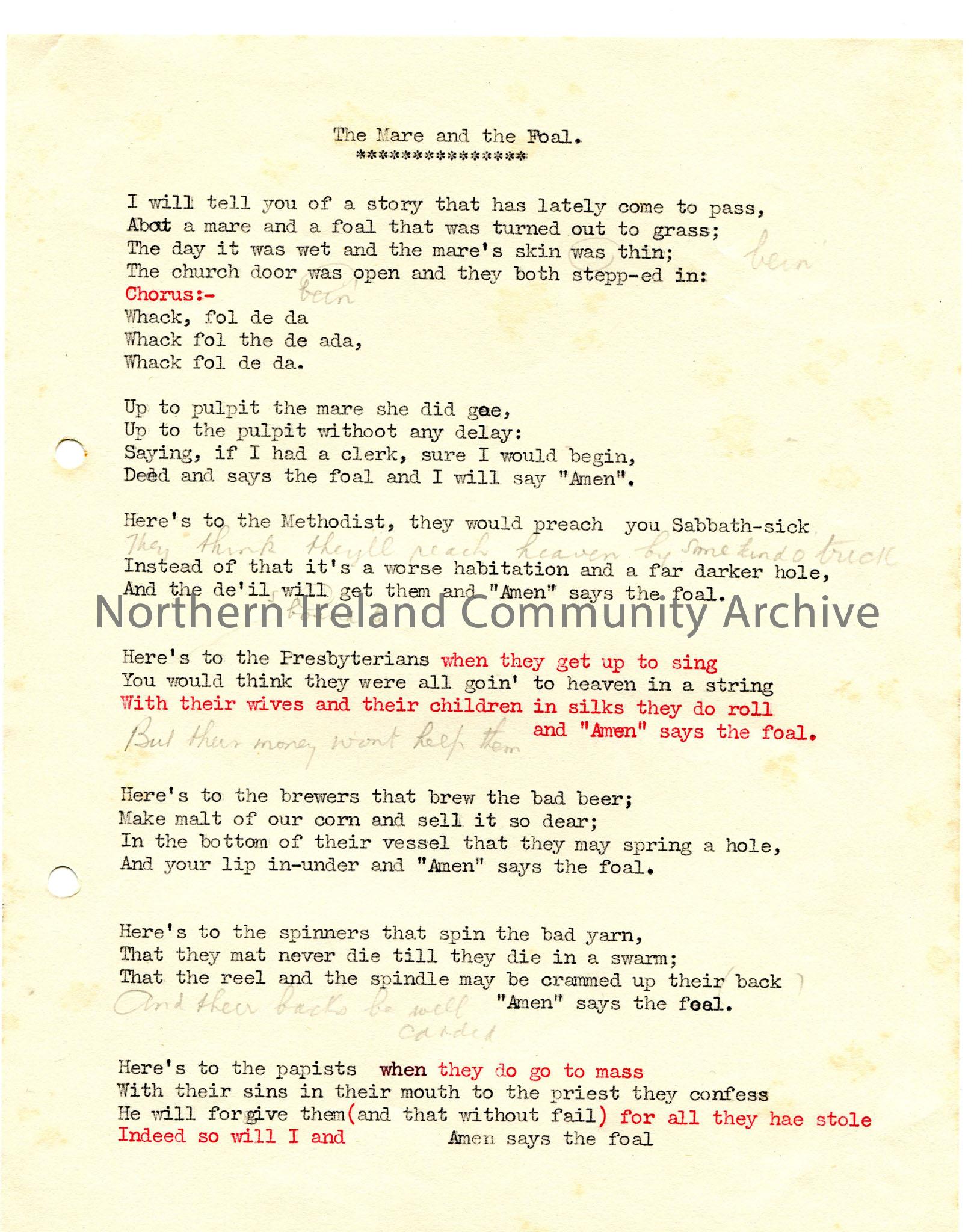 Typed words to alternative version of 'The Mare and The Foal', with handwritten inserts making it slightly different to CM:2014:49