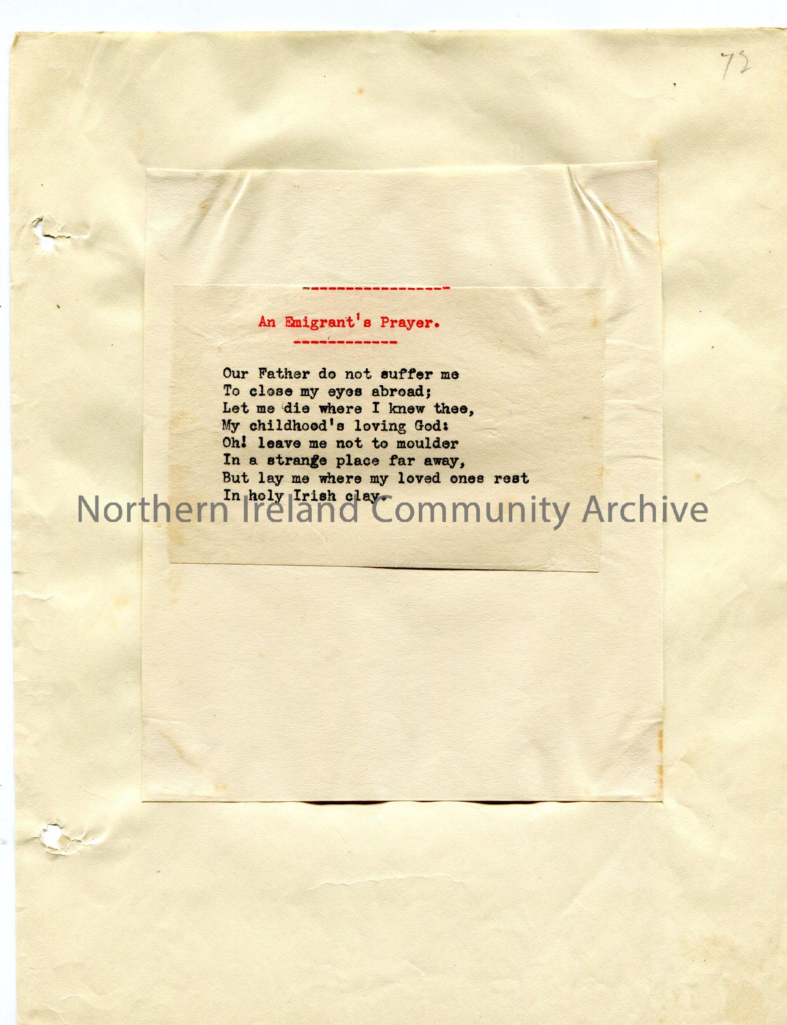 Typed words to 'An Emigrant's prayer'. Page from loose manuscript of Rowlock Rhymes and Songs of Exile- a book of verse edited by Sam Henry. The author, Robert McMullan from Portballintrae, had the pen name 'North Antrim' and was "imbued with the Celtic spirit" and interested in the fishermen of the north coast of Antrim