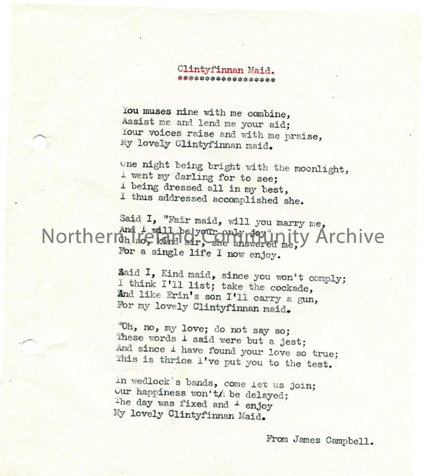Typed words to 'Clintyfinnan Maid'. From James Campbell.