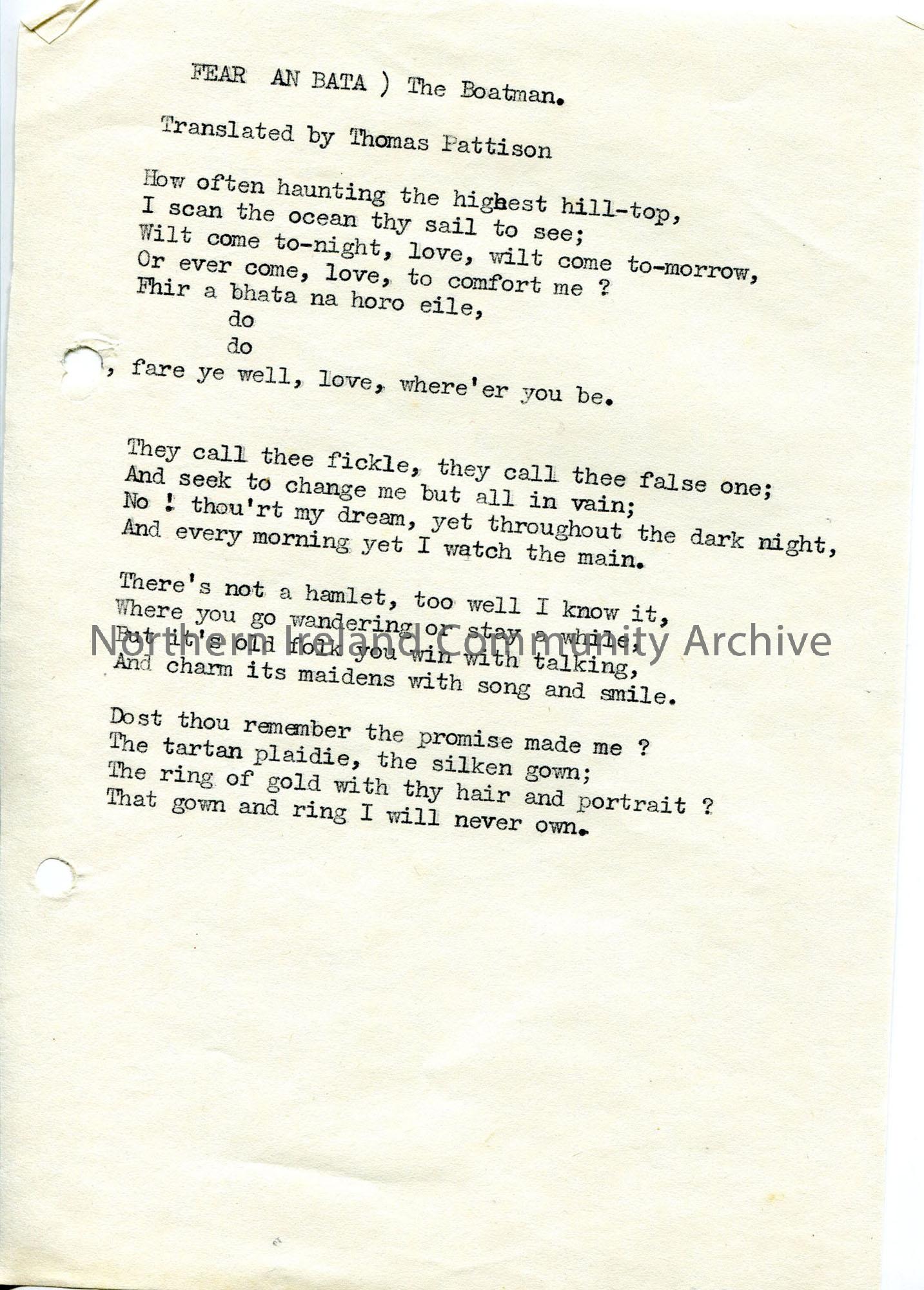 Typed words to ‘Fear an Beata – The Boatman’. Uses local dialect.