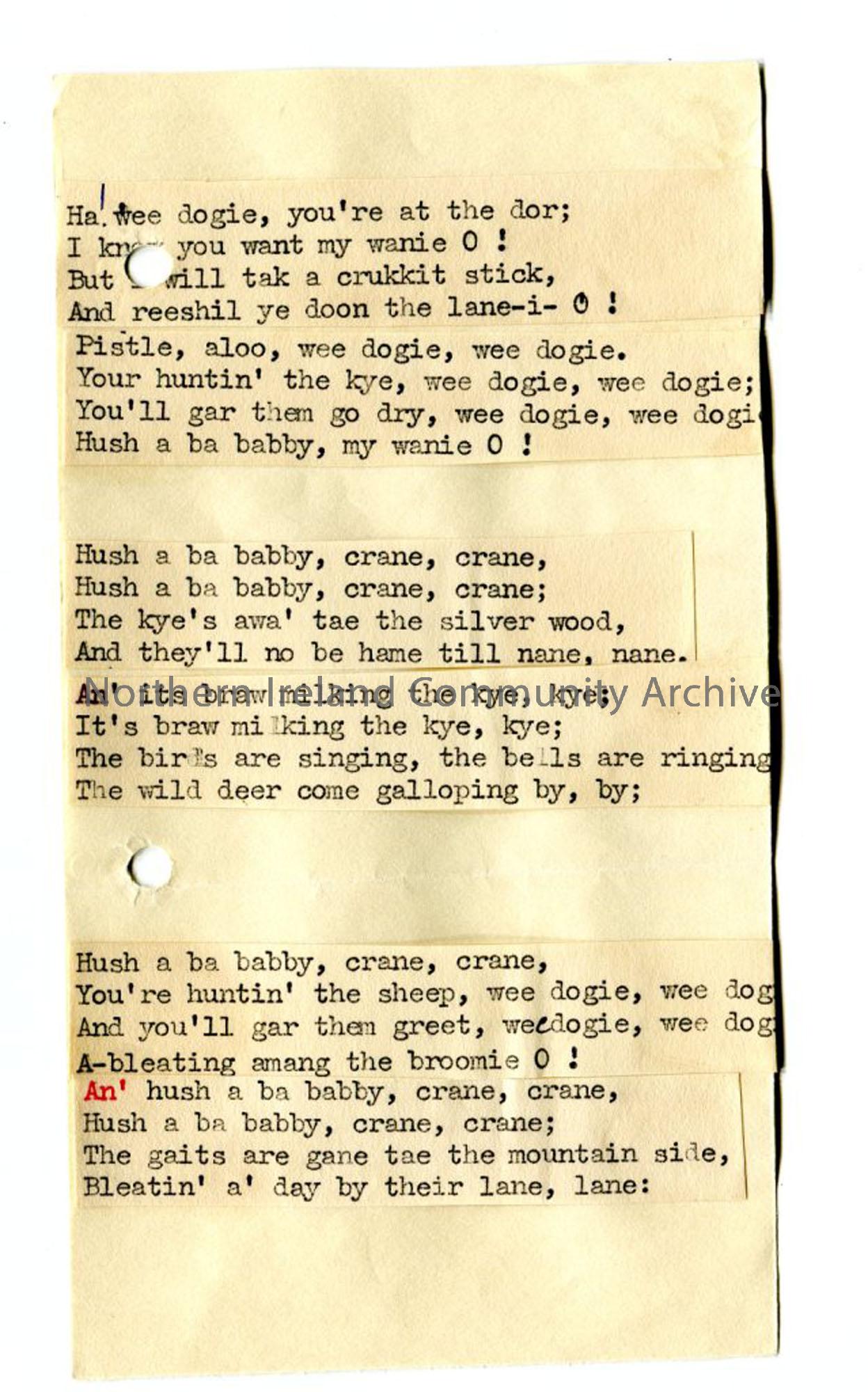 Typed words to 'Ha Wee Dogie You're at the Dor' - on pieces of paper affixed to page - some lines are wrapped around edge of page.
