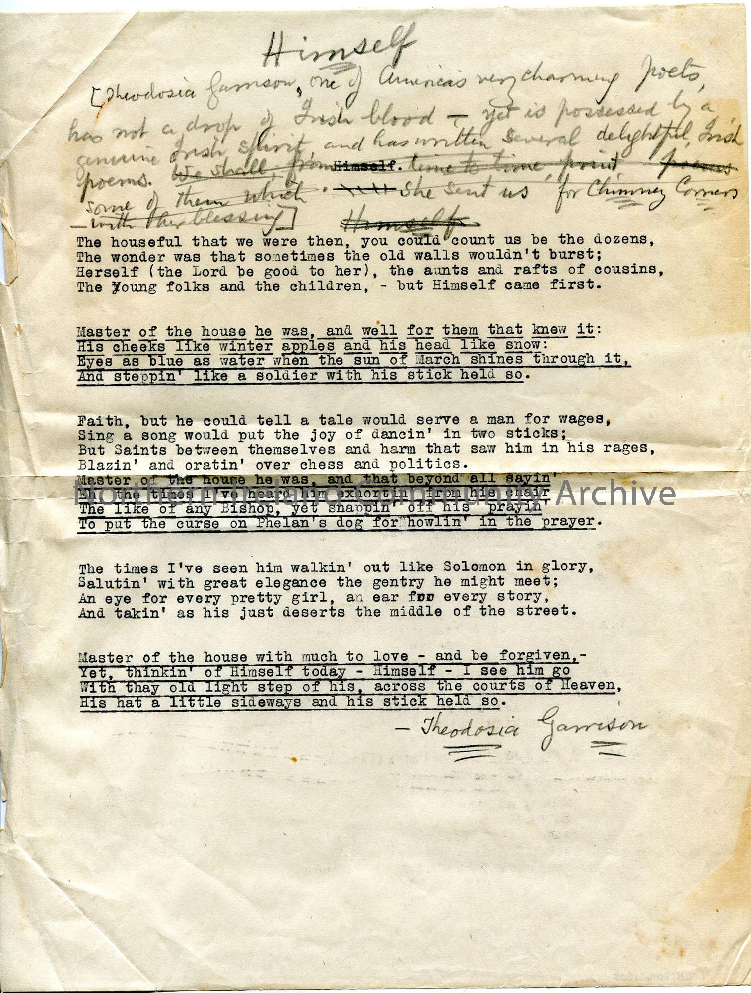 Typed words to 'Himself', with handwritten additional notes about poet Theodosia Garrison who sent some poems for 'Chimney Corners'