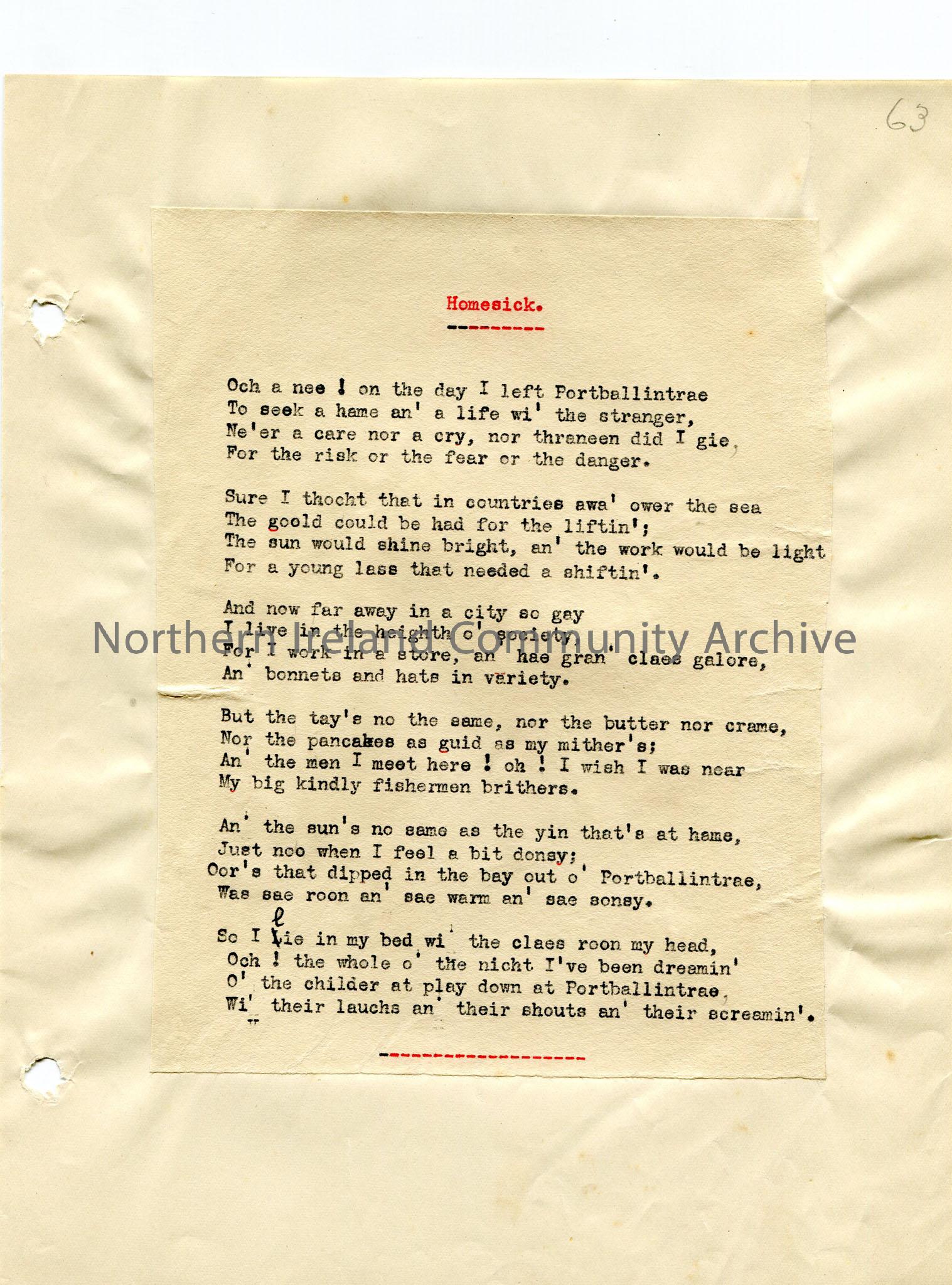Typed words to 'Homesick' affixed to page. Uses local dialect. Mentions Portballintrae. Page from loose manuscript of Rowlock Rhymes and Songs of Exile- a book of verse edited by Sam Henry. The author, Robert McMullan from Portballintrae, had the pen name 'North Antrim' and was "imbued with the Celtic spirit" and interested in the fishermen of the north coast of Antrim