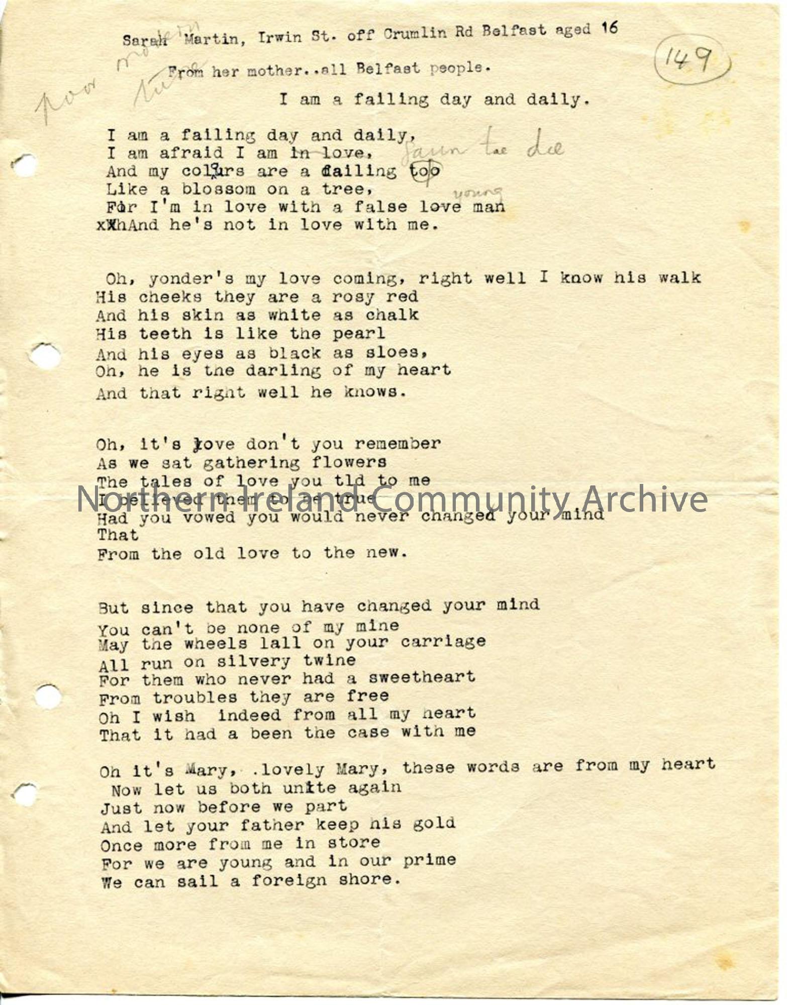 Typed words to 'I am a failing day and daily' Donor Martin, Sarah. Aged 16. Learned from 'her mother...all Belfast people'.
