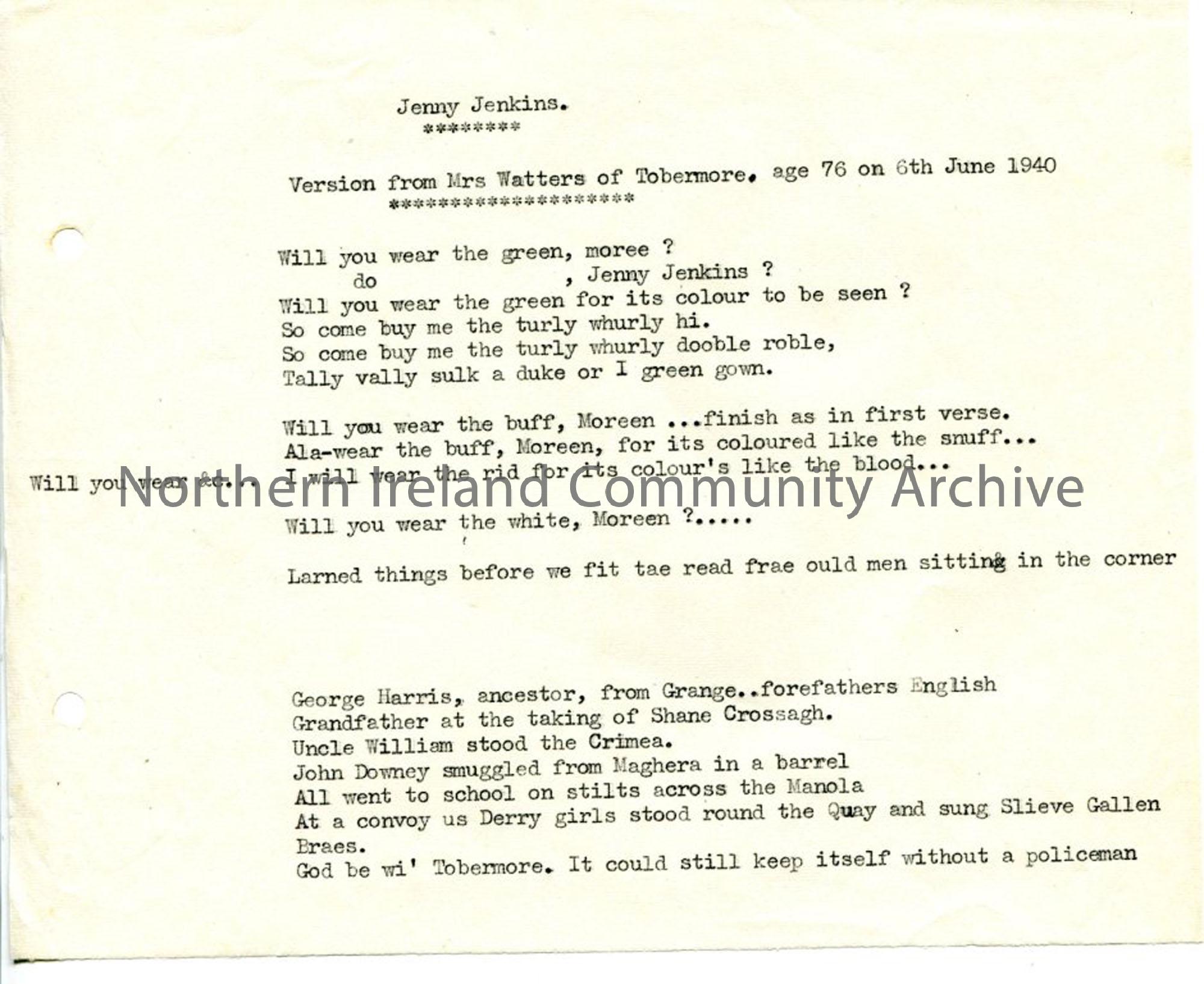 Typed words to 'Jenny Jenkins'. Uses local dialect - not in song but in telling of childhood and family stories, also included. ? singing game.