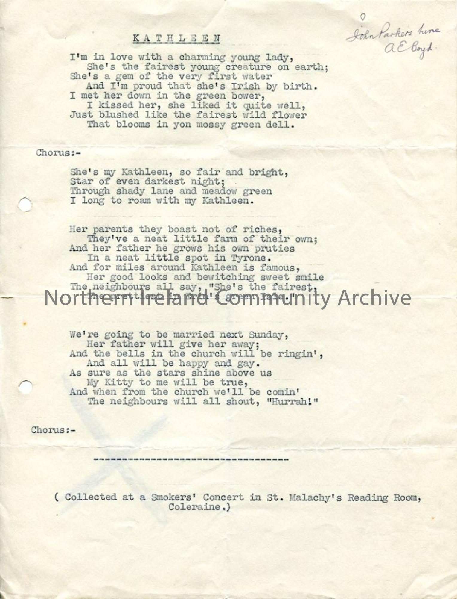Typed words to 'Kathleen' - collected at Smoker's Concert. Smokers' Concert St Malachy's Reading Room, Coleraine.