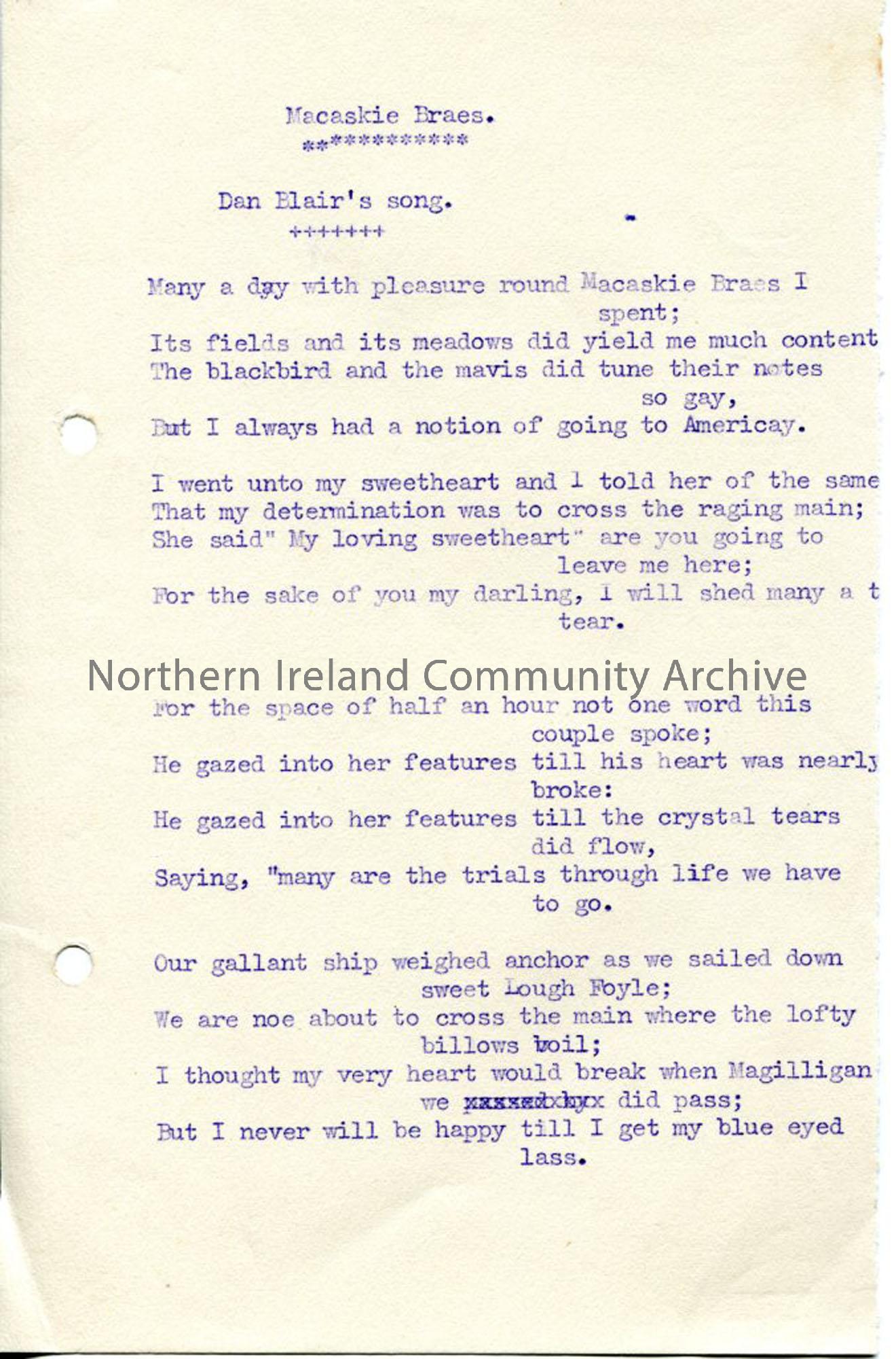 Typed words to ‘Macaskie Braes’ – ‘Dan Blair’s Song’