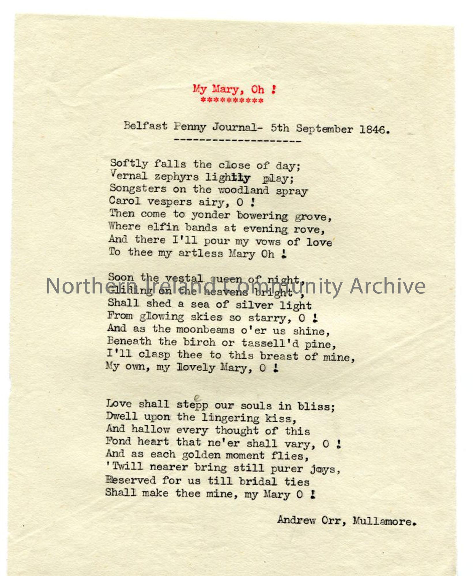 Typed words to 'My Mary, Oh!'. Poem by Andrew Orr.