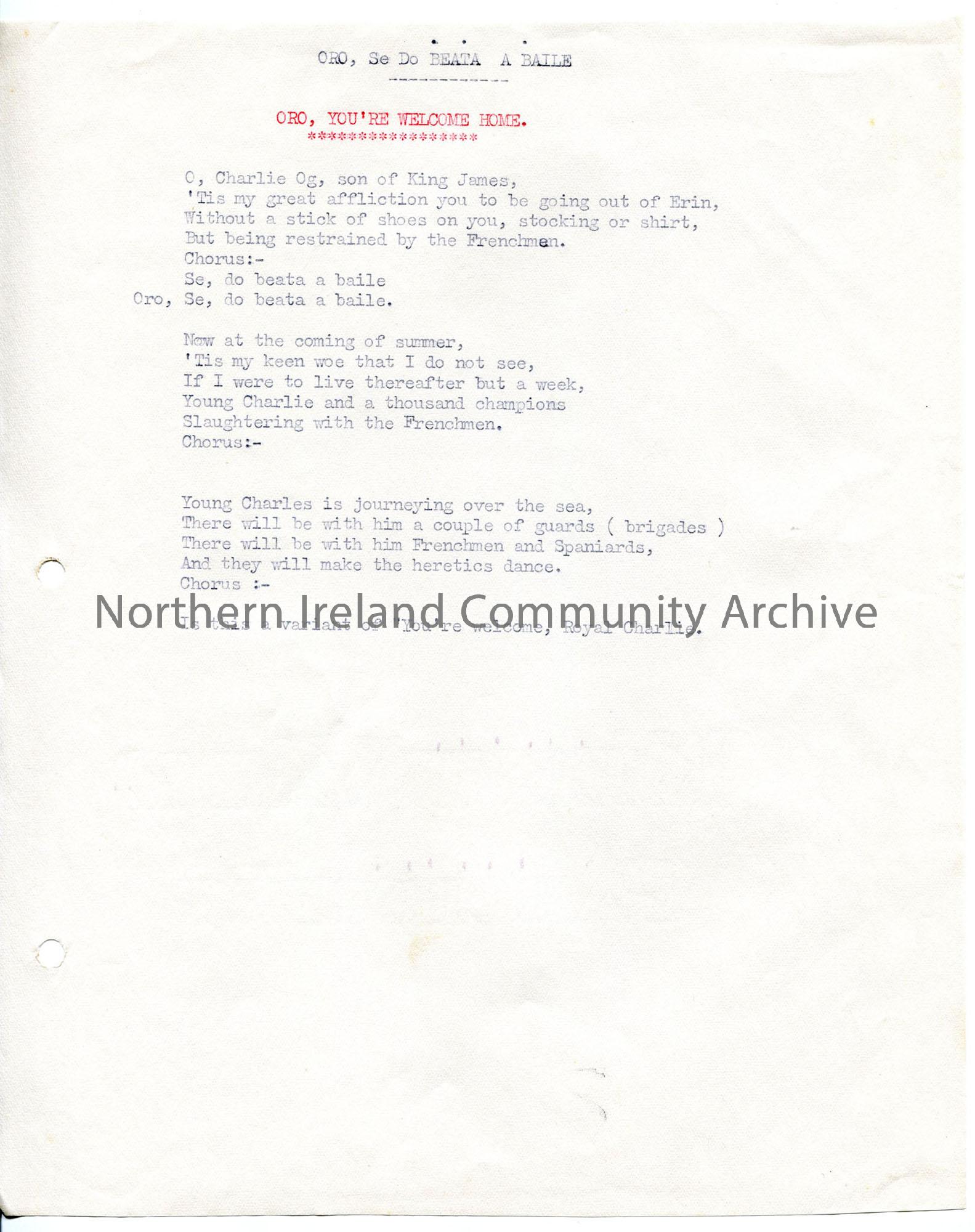 Typed words to ‘Oro, Se Do Beata A Baile – Oro, You’re Welcome Home’. About Charlie Og – Bonnie Prince Charlie – leaving Ireland