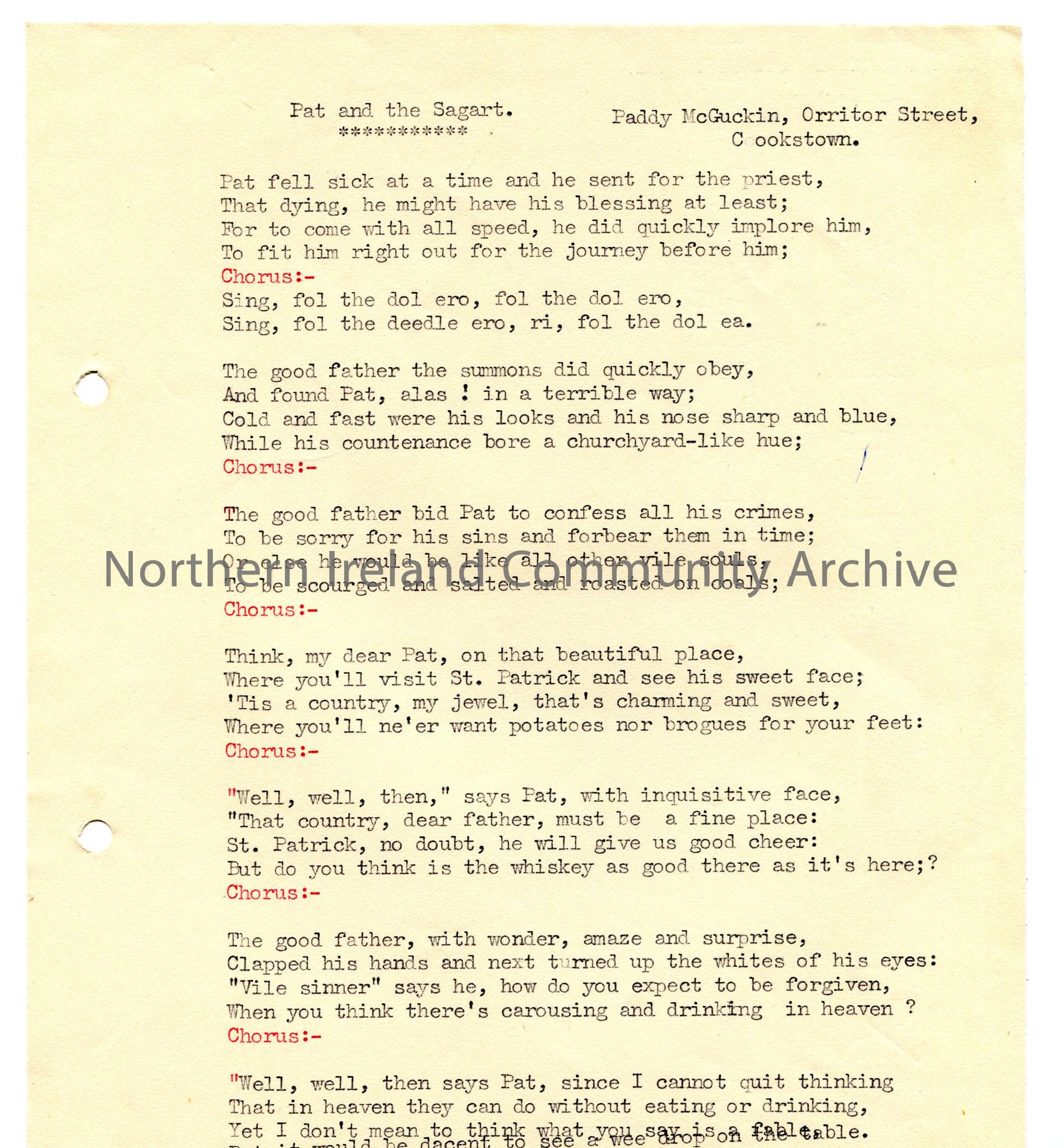 Typed words to ‘Pat and the Sagart’. (Sagart = priest)
