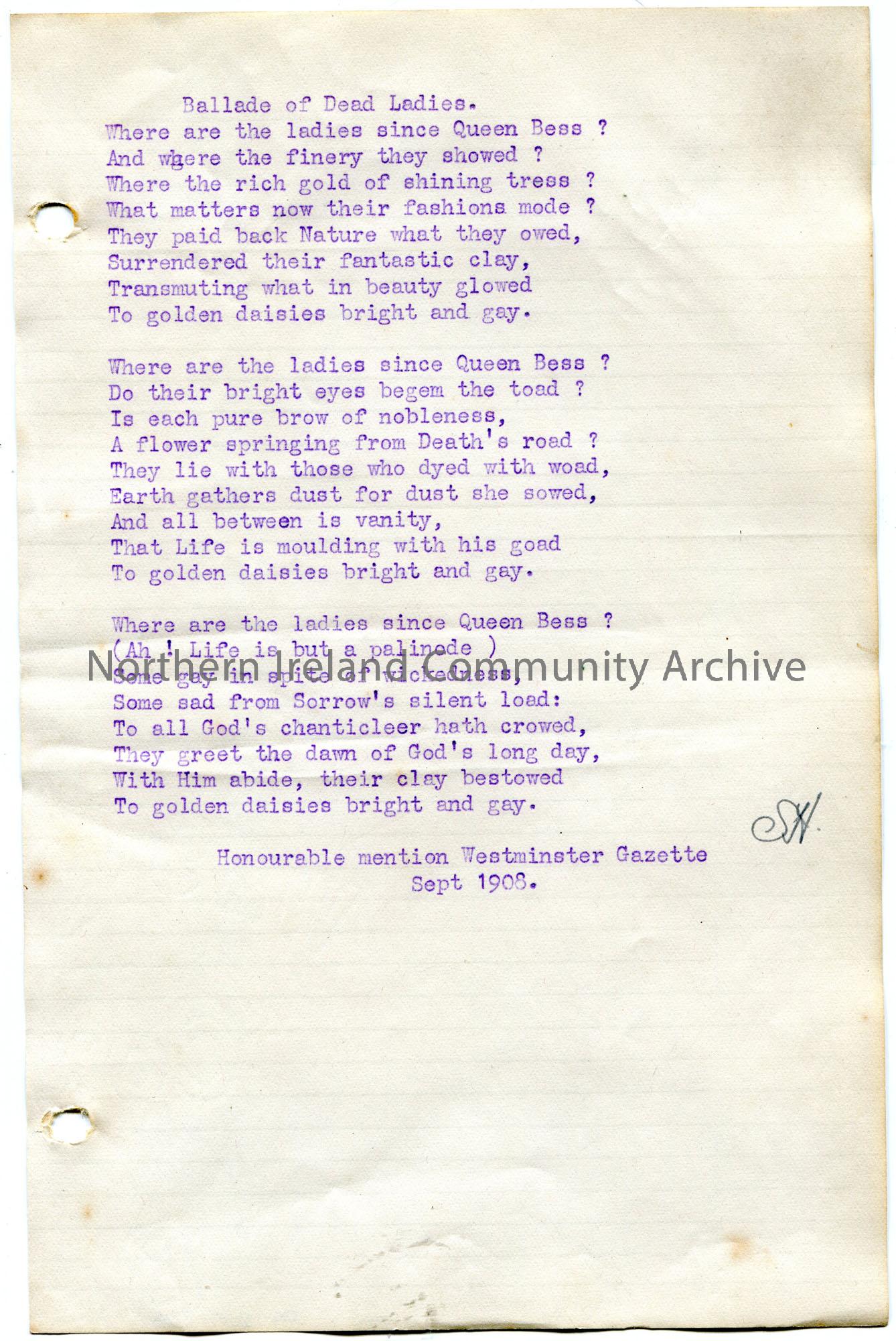 Typed words to poem titled, ‘Ballade of Dead Ladies’. An ‘Honourable mention in the Westminster Gazette Sept 1908’ typed below song. ‘SH’ initials.