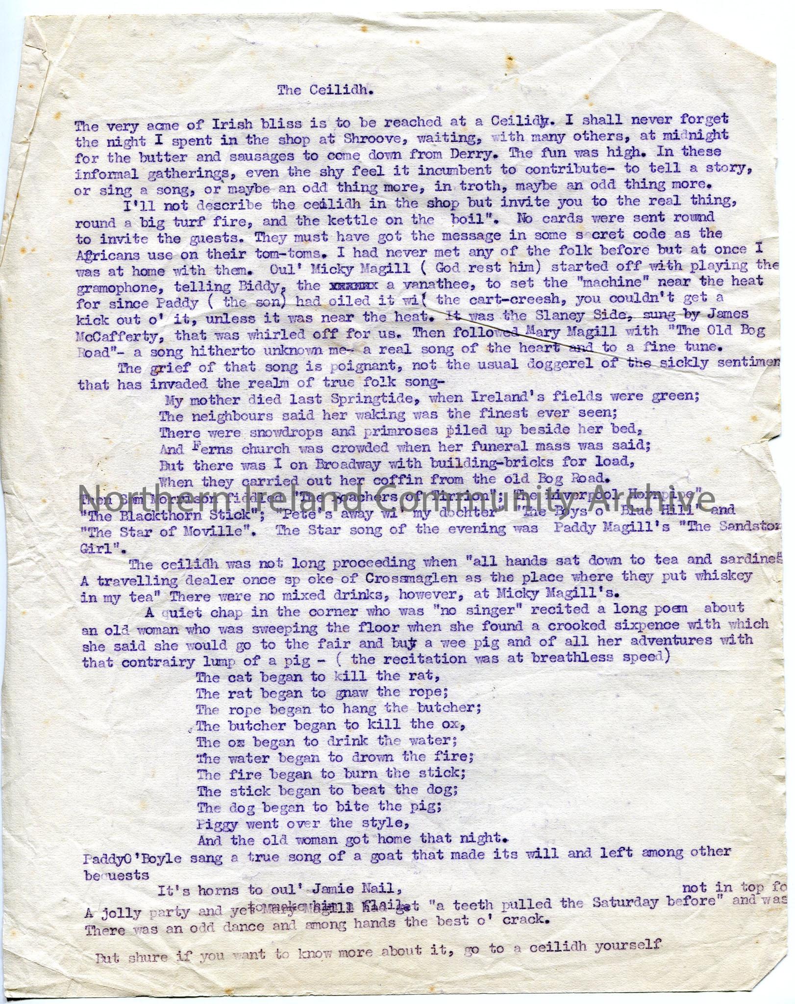Typed words to short ? broadcast script/ newspaper article on 'The Ceilidh'. Describes ceilidh event, music played, refreshments given - at 'Oul Mickey Magill's'