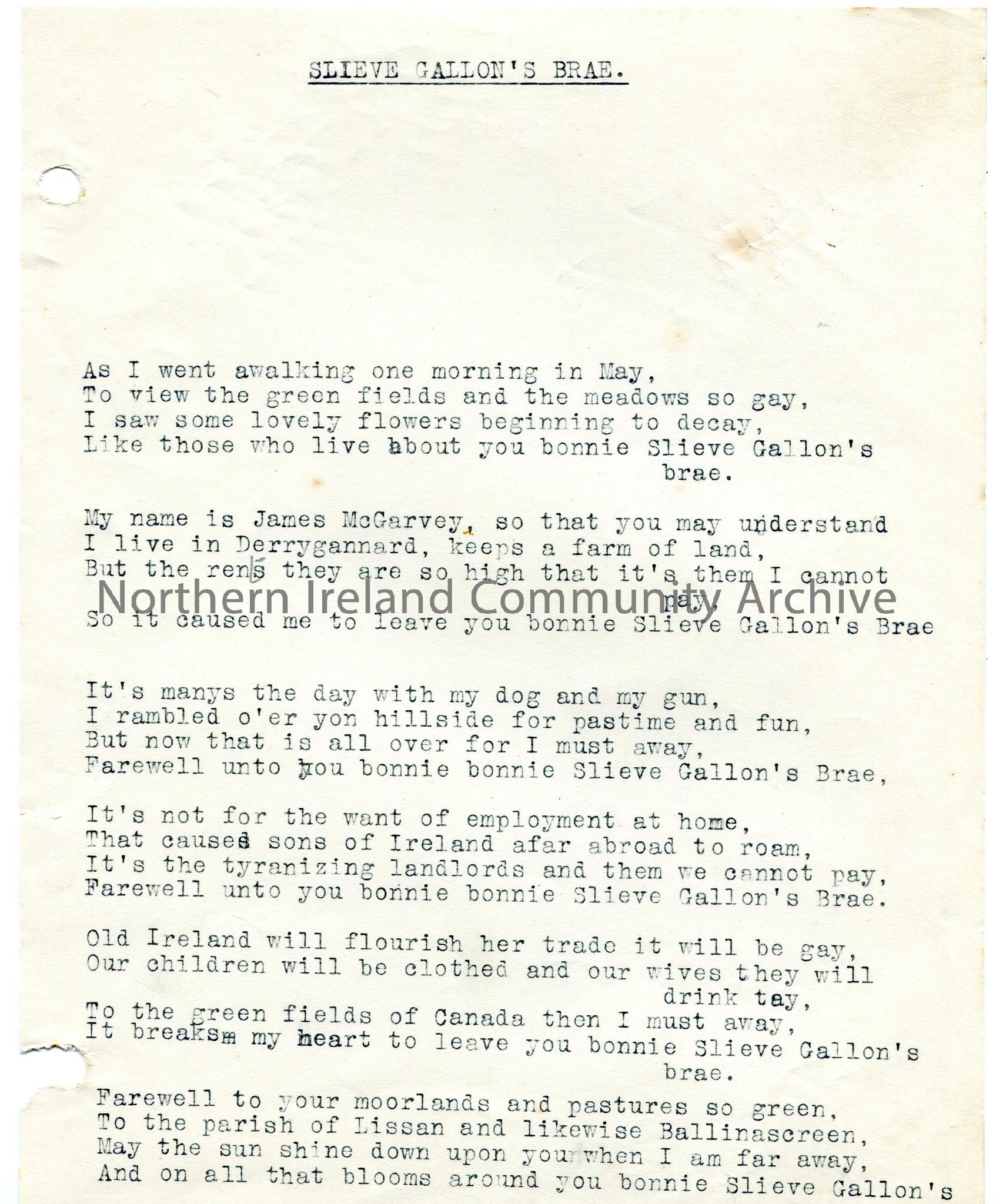 Typed words to 'Slieve Gallon's Brae'. Uses local dialect